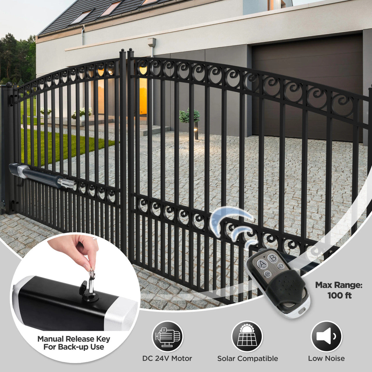 - ALEKO’s GG1700FULL Swing Gate Opener 60W Solar Kit is compatible with a variety of dual-swing gate styles.