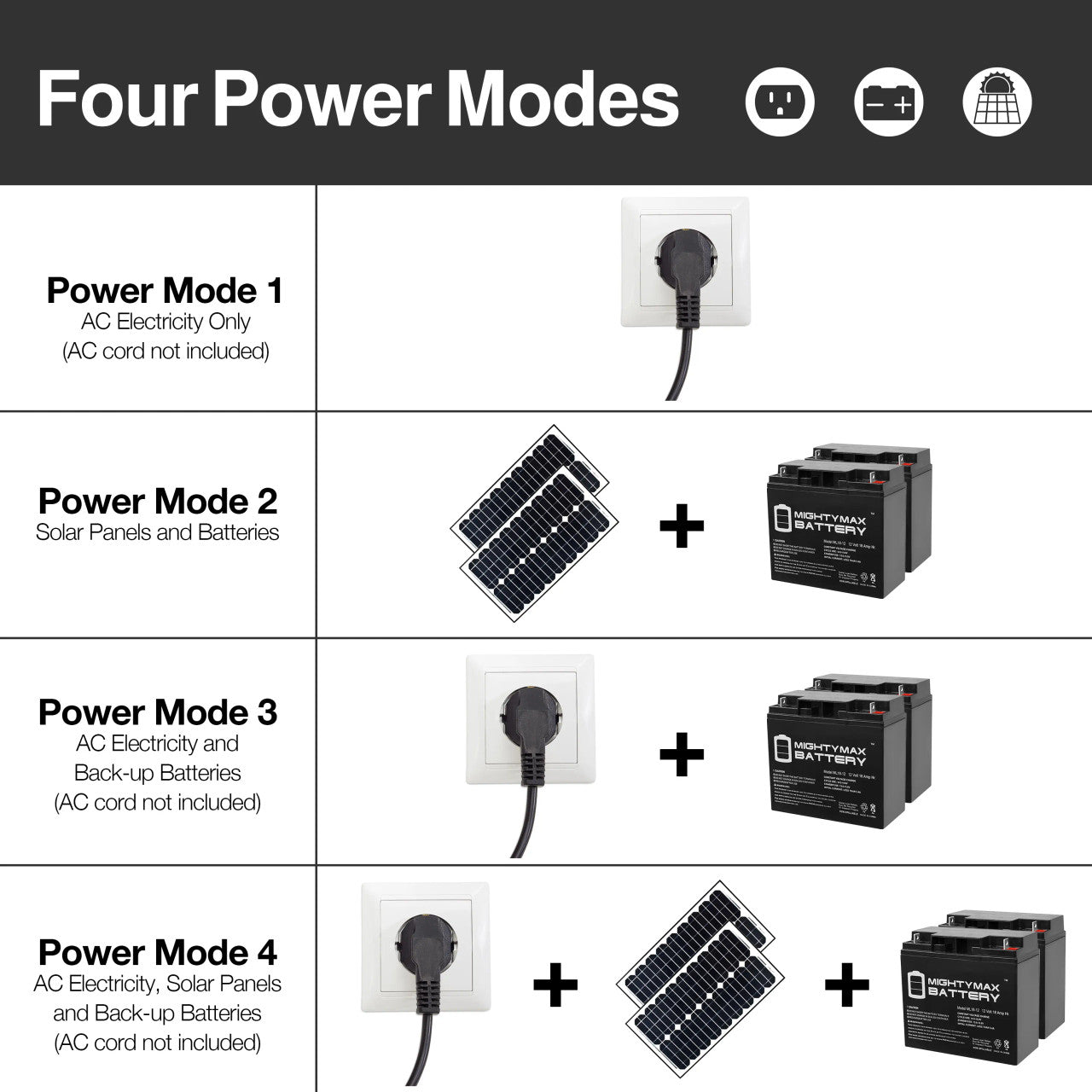 | Power Modes | AC Electricity Only; Solar Panels and Batteries; AC Electricity and Back-Up Batteries; AC Electricity, Solar Panels, and Back-Up Batteries |