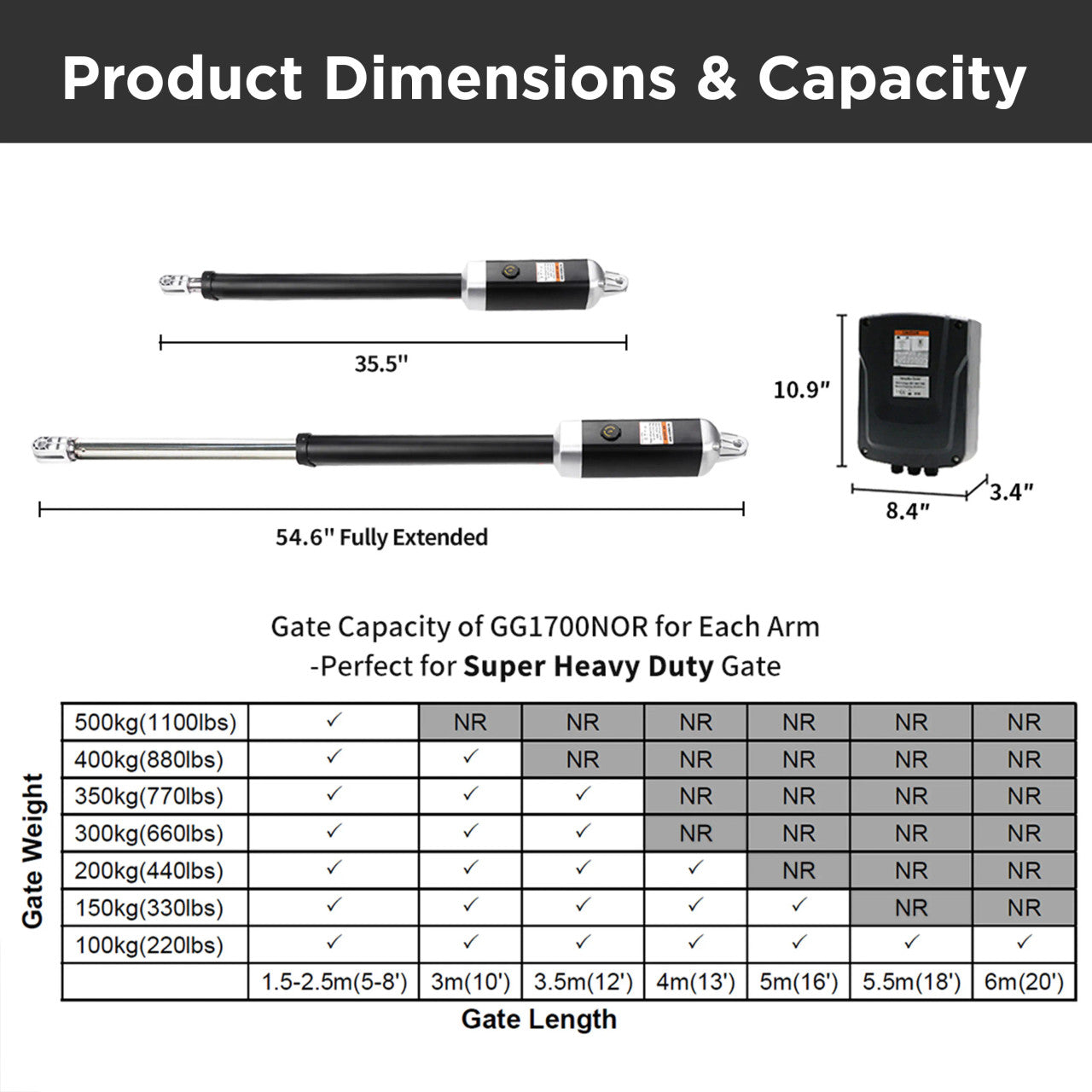 | Kit Includes-12AH Batteries | (2) Actuators; (2) 12 AH Batteries; (1) Battery Box; (1) 24V Adapter/Battery Charger; (1) Control Box; (2) 433 MHz Remotes; (2) Emergency Release Keys; (3) 8.5 x 11-in. Warning Signs; (1) Set of Mounting Hardware; (1) User Manual |