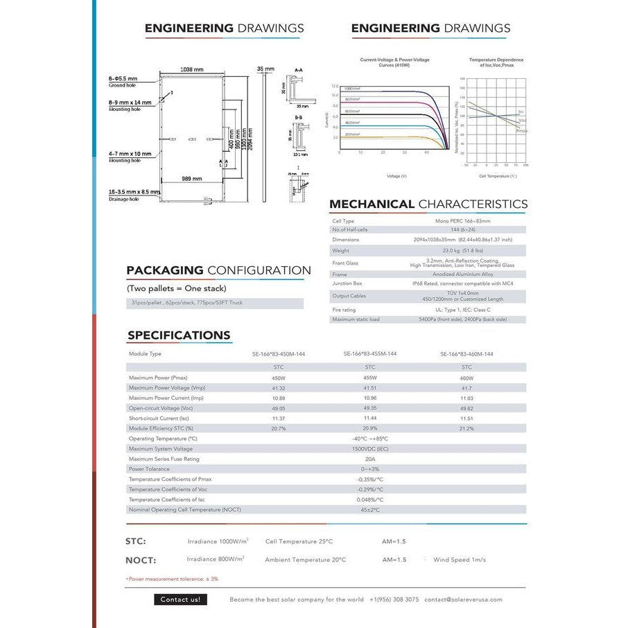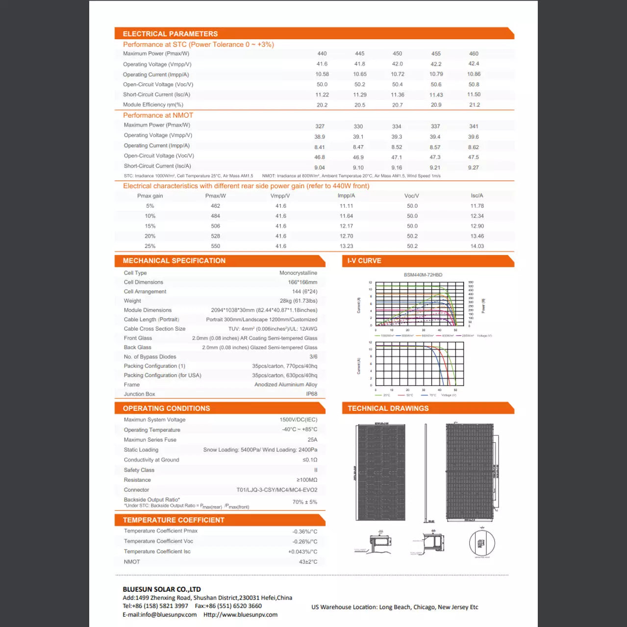 A: 24 x Bluesun 460 Watt Bifacial Solar Panels (up to 11,040 Watts PV! 6 Panels Per MPPT) – 30 Year Power Warranty