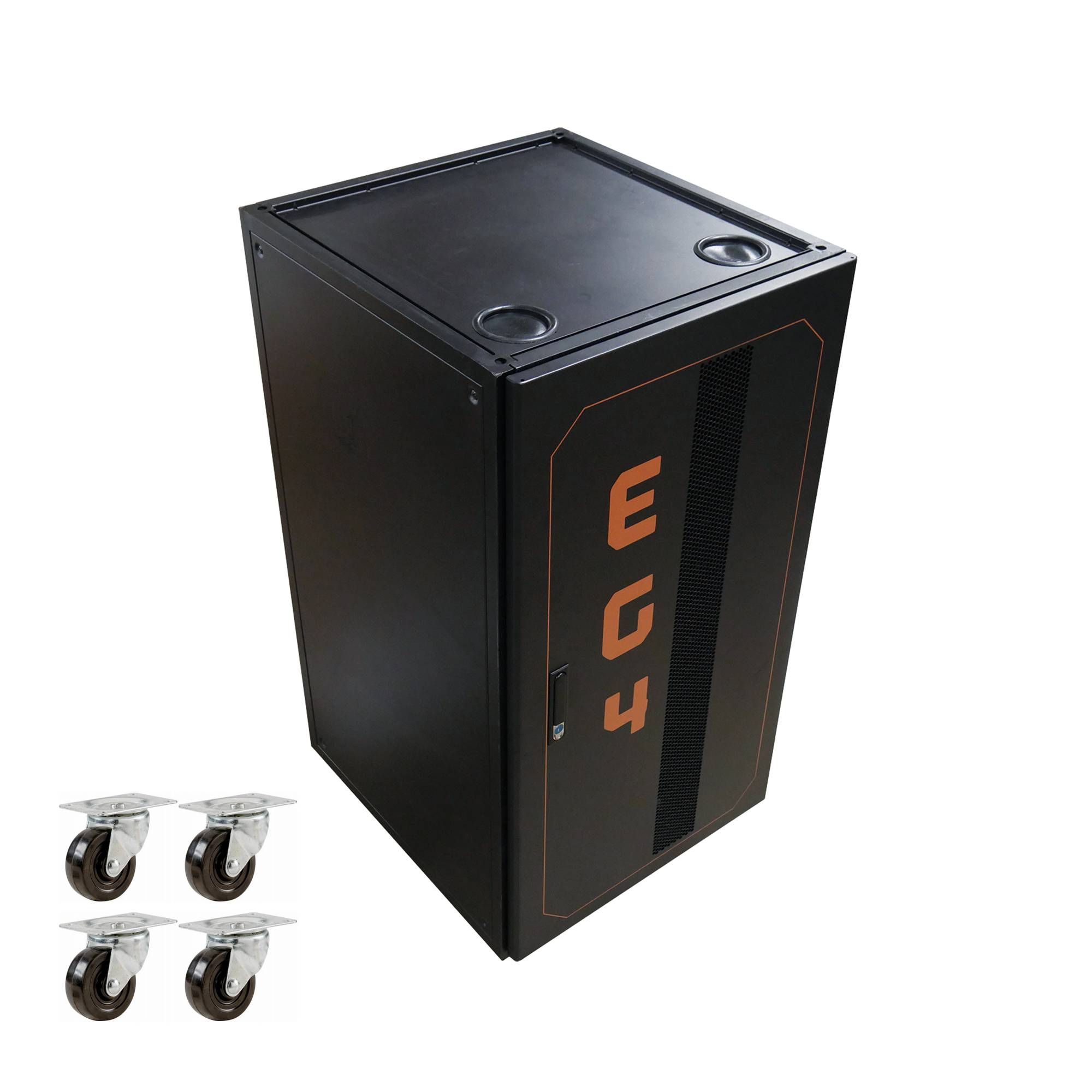 EG4 Storage Solutions 6 Slot Battery Rack, featuring an enclosed cabinet design. The cabinet door swings open on a sturdy hinge, allowing easy access to the equipment and cables for easy installation. The door panel locks securely to help prevent damage, tampering, and/or theft. The front door is vented, allowing for air to flow freely and keep equipment cool. Top and bottom ports allow for easy cable routing.