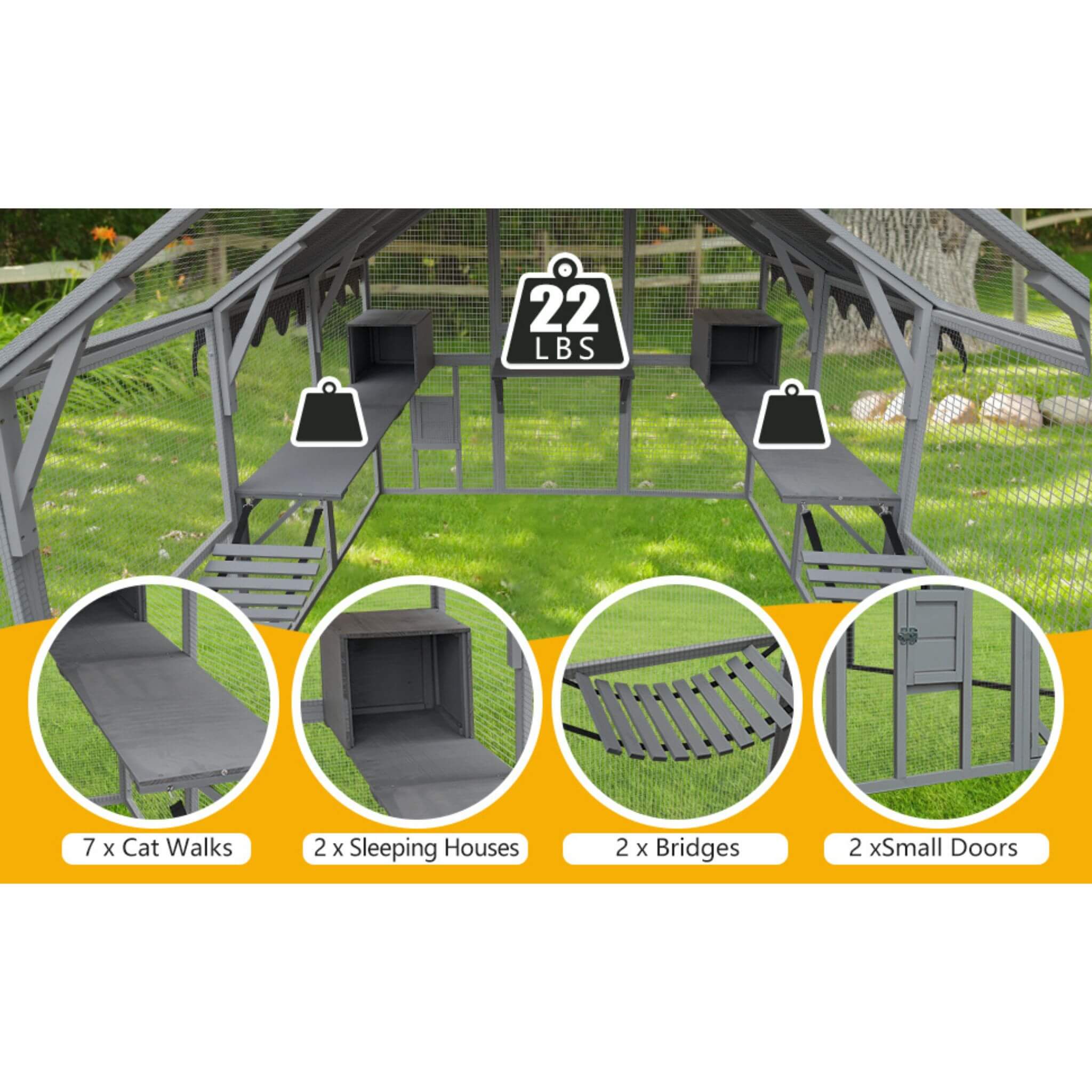 - Featuring a spacious interior with 2 bridges, 2 sleeping houses, and 7 cat walks, this cat house is designed to offer your furry friends a comfortable and fun space.