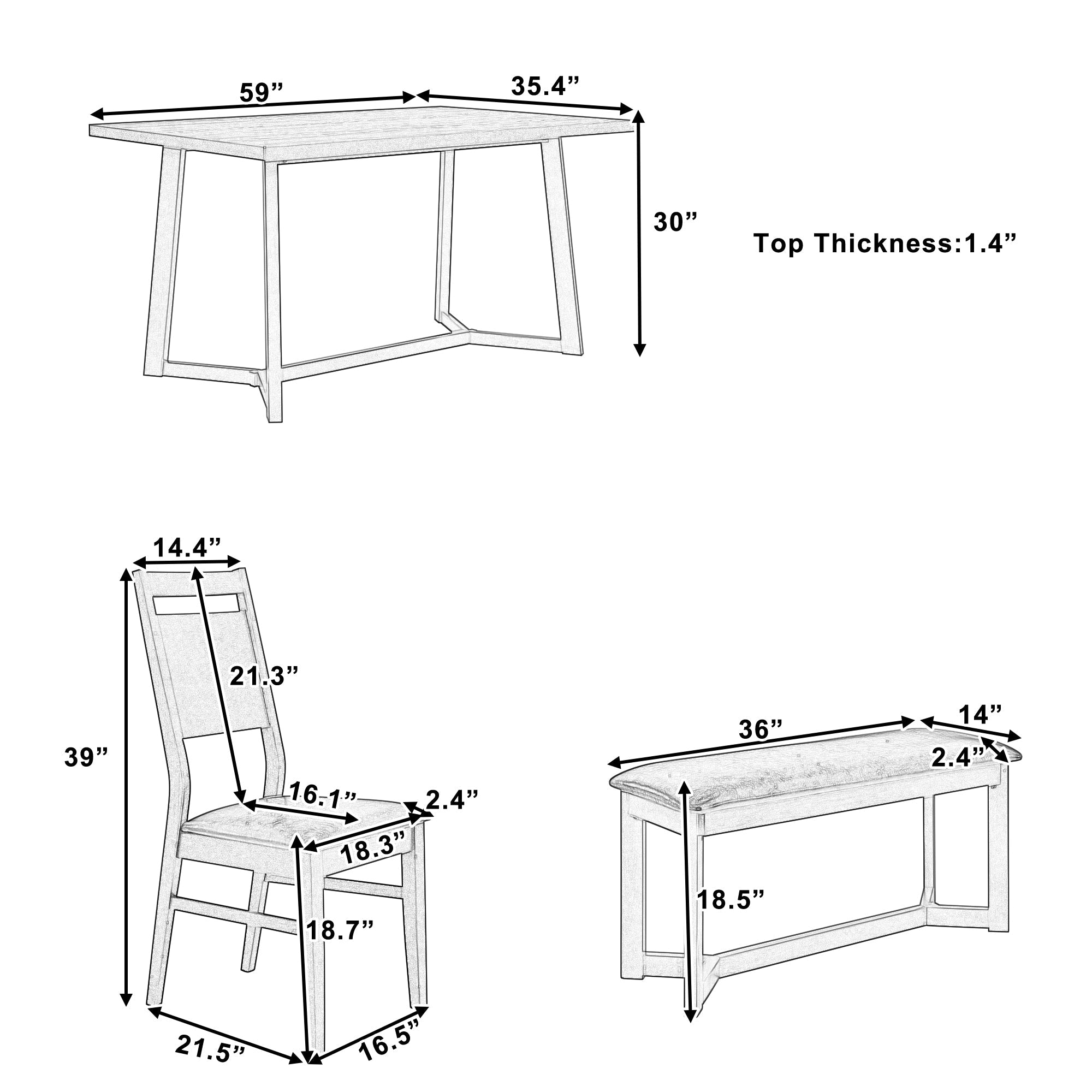 | Overall Product Dimension | Dining Table:59×35.4x30inch(LXWXH); Top Thickness:1.4inch; Dining Chair: 16.5×21.5x39inch(LXWXH); Seat Depth:16.1inch; Seat to Floor:18.7inch; Dining Bench:36x14x18.5inch(LXWXH) |
