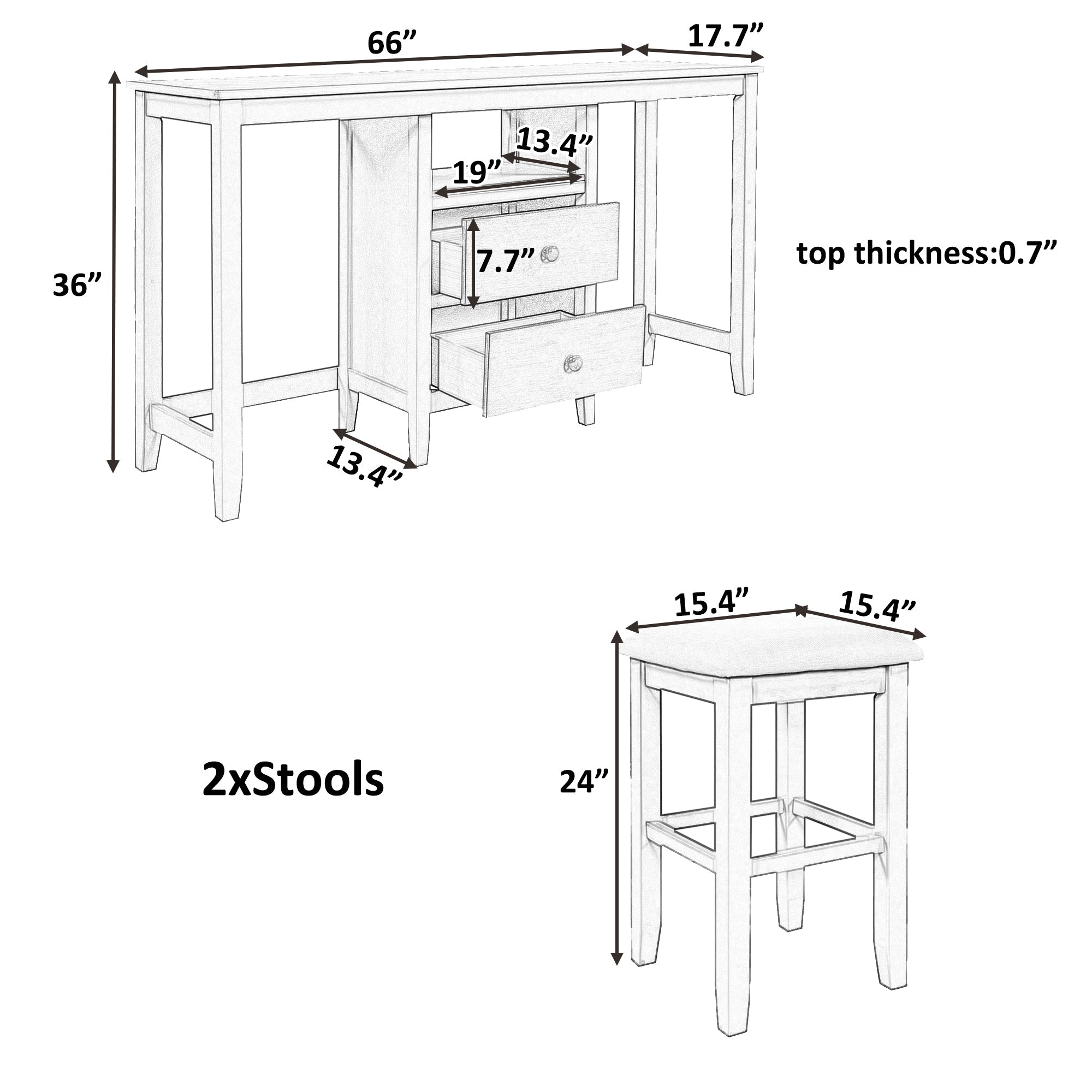 | Overall Product Dimension | Table: 66*17.7*36 inch(L*W*H); Tabletop Thickness: 0.7 inch; Each Drawer: 19*13.4*7.7 inch(L*W*H); Stool: 15.4*15.4*24 inch(L*W*H); Stool Cushion Thickness: 2inch |