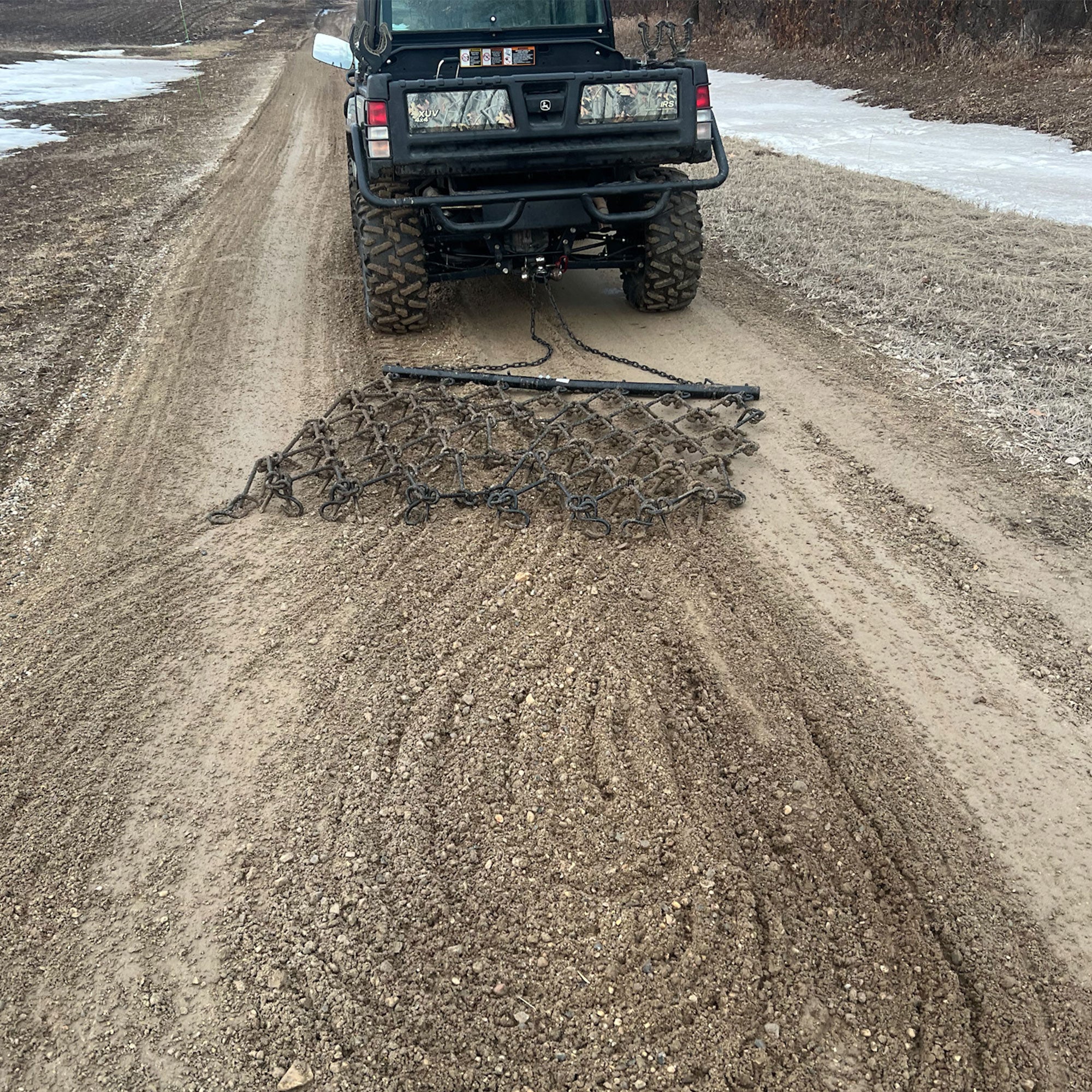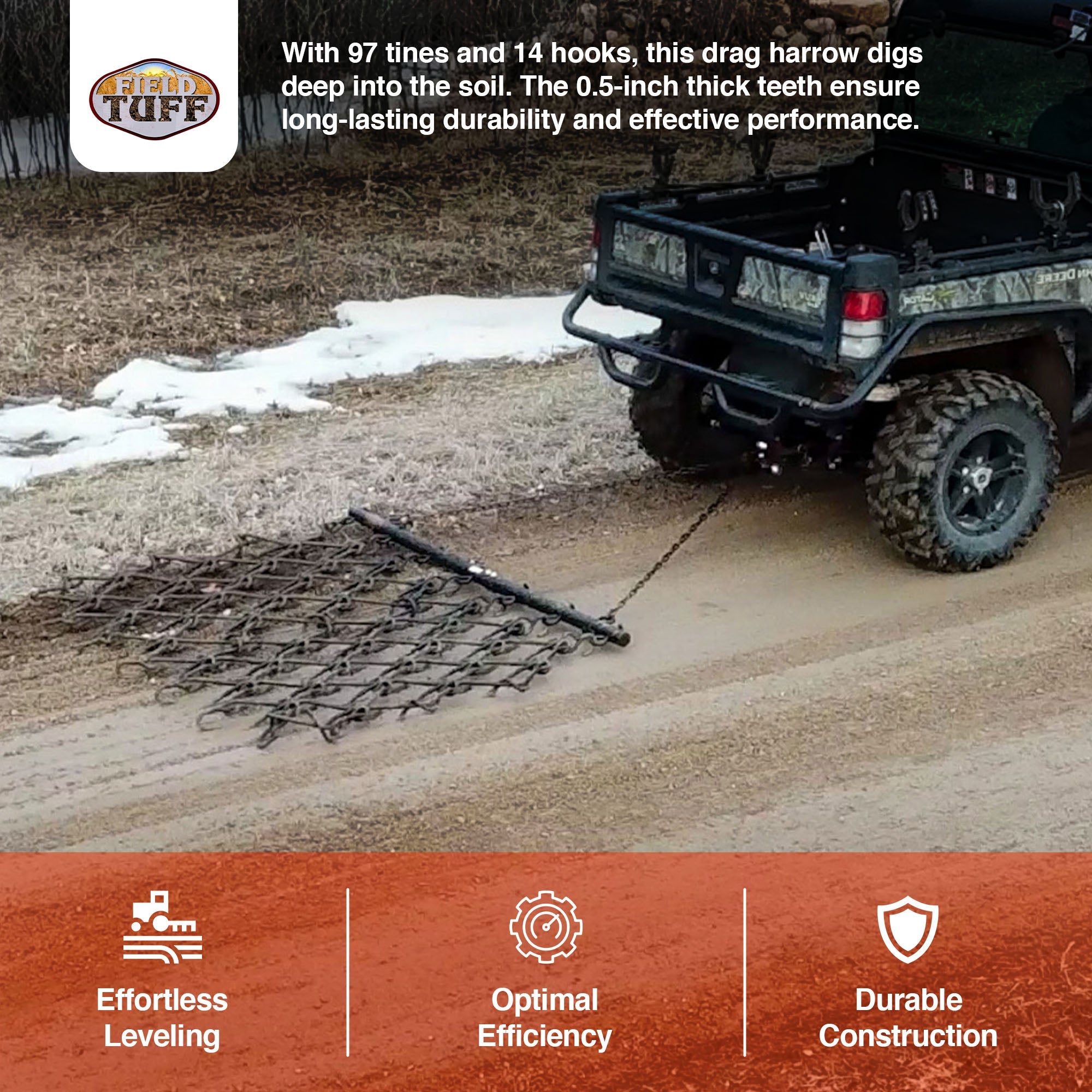 Measuring 6 feet by 4 feet, this drag harrow offers a wide working width, ensuring optimal efficiency for your landscaping tasks. Its 97 robust tines and 14 hooks are designed to dig deep and deliver superior results in breaking up soil and leveling plots. Crafted with 0.5-inch thick teeth, this drag harrow guarantees durability and effective performance. Its innovative design allows additional dragging options; simply flip the drag over or switch the tow bar to the opposite end to suit your specific needs. The tow chain is compatible with any 2-inch ball, making it easy to pull behind ATVs, UTVs, and lawn tractors. Built to last, the Field Tuff drag harrow features a durable powder-coat paint finish that withstands the elements and withstands wear and tear. This versatile tool is perfect for leveling plots, breaking up soil, leveling pastures, and grading, ensuring your land is in prime condition. Whether working in the yard, driveway, or field, this heavy-duty drag harrow is indispensable for maintaining and preparing your outdoor spaces.