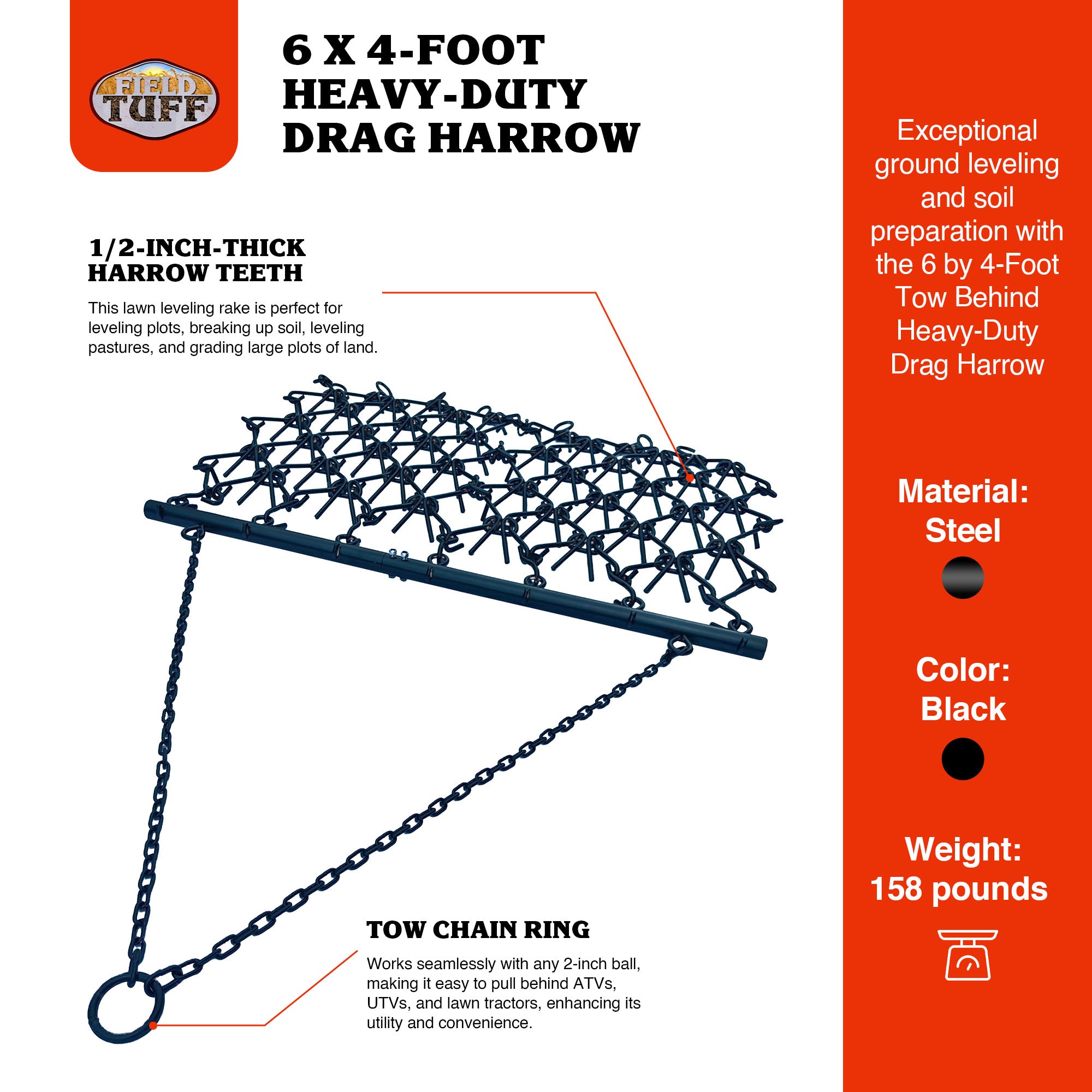 Achieve exceptional ground leveling and soil preparation with the Field Tuff 6 by 4-Foot Tow Behind Heavy-Duty Drag Harrow.