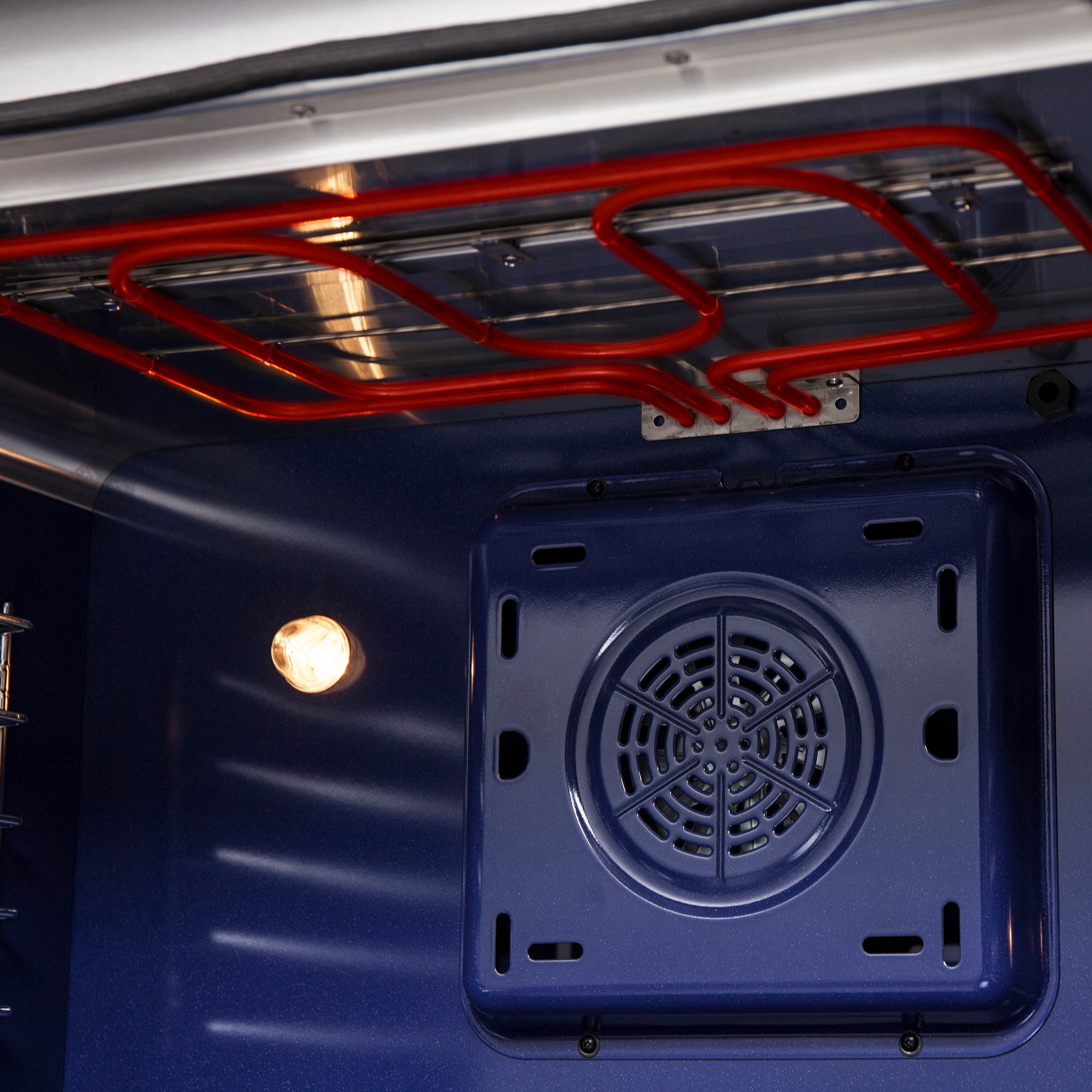 - Convection Oven. The 5.36 cu. ft. oven features a 6,300-watt convection fan for even and efficient cooking, with a speckled blue enamel interior and 2 halogen lights for visibility