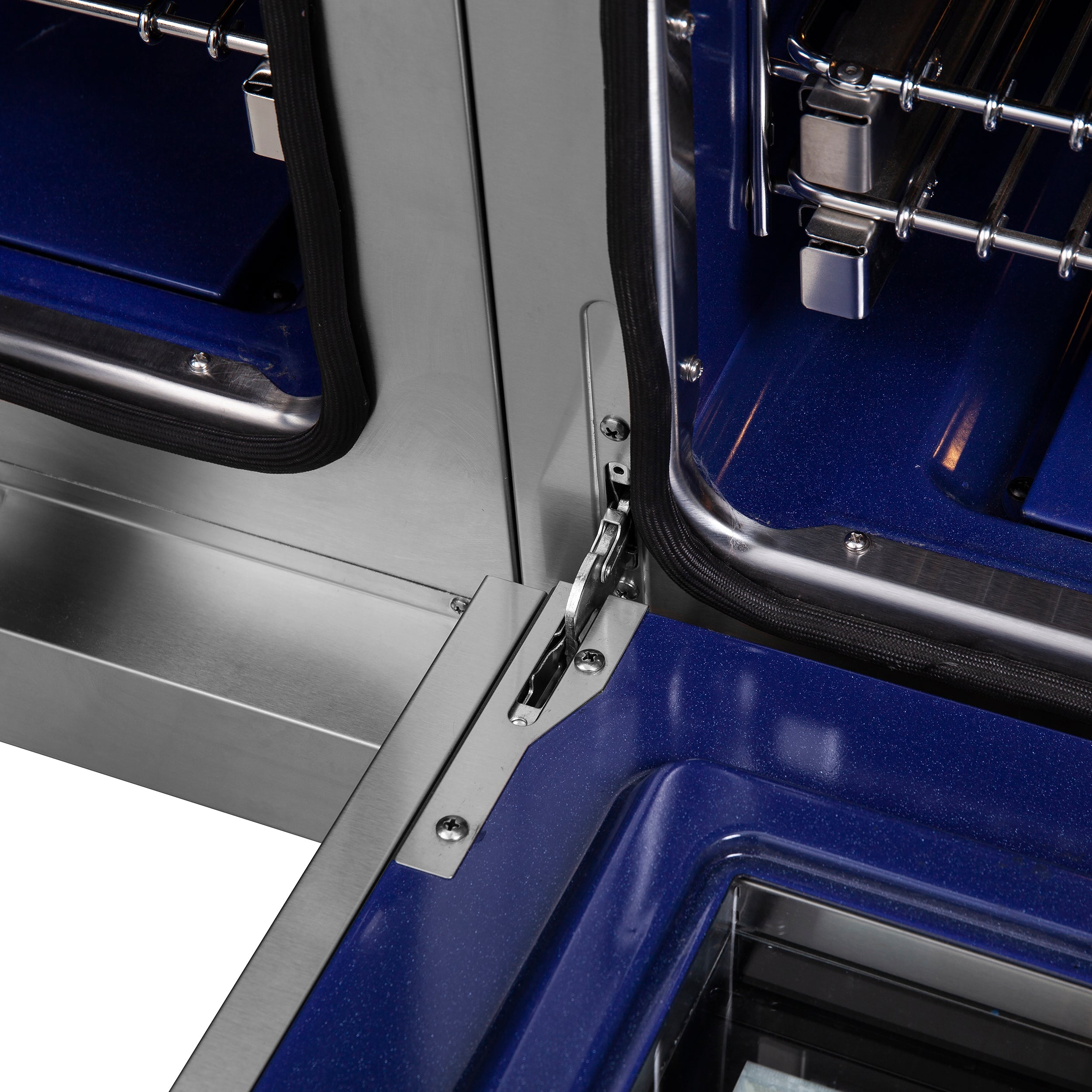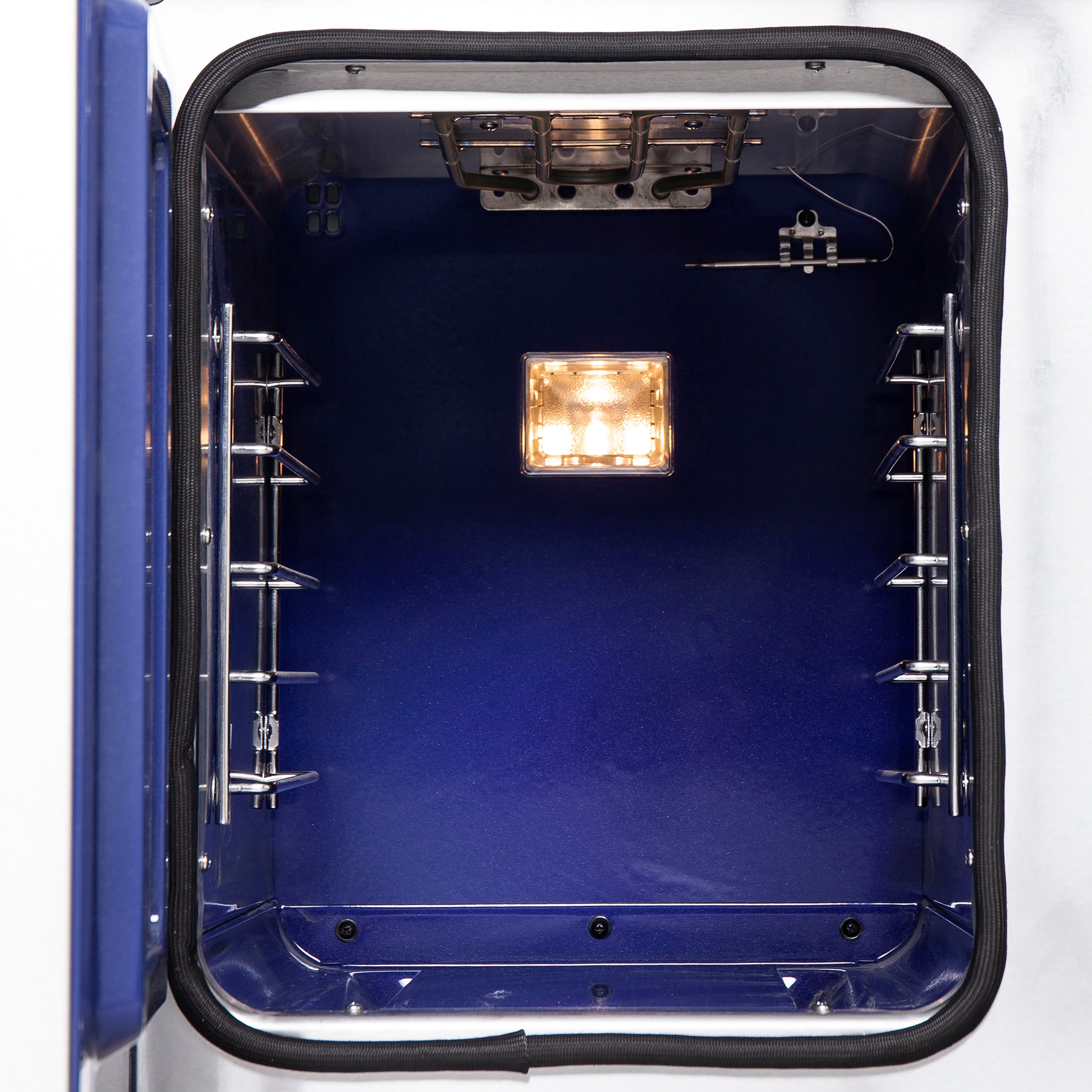 - Illuminated Oven Interior. The speckled blue enamel oven interior features 3 halogen lights, offering visibility and an elegant touch