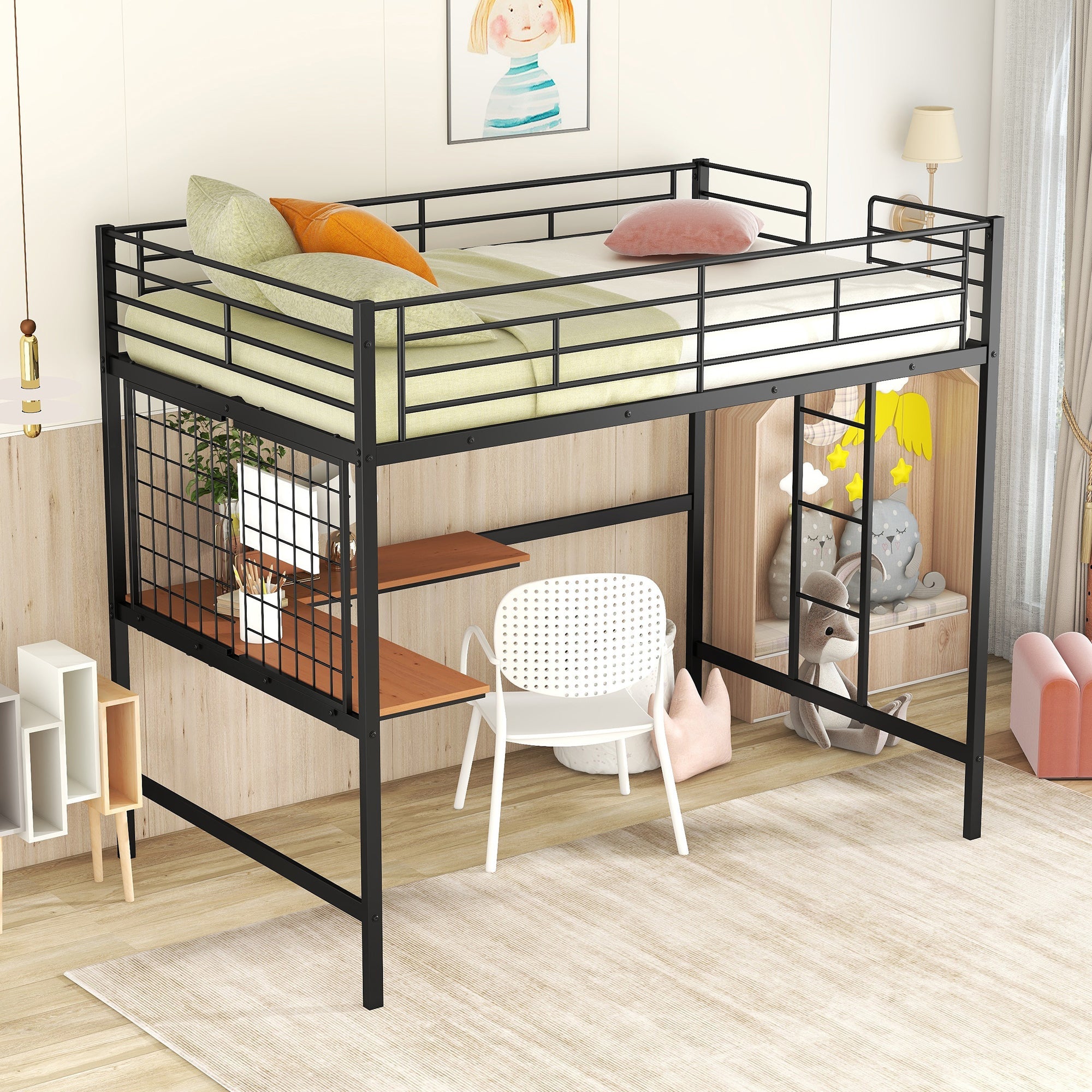 This Full size metal loft bed with desk is made with sturdy metal and has a clean-cut silhouette that can be matched with any room decor. Designed with safety in mind, this loft bed comes with a ladder integrated into the frame that is easy to climb up and down. It also incorporates full-length guardrails to ensure your kid sleeps safely at night as well as 20 secured heavy-duty metal slats and a support bar that provide ample support, stability and air circulation for the mattress (no foundation or box spring needed). With this collection, you can turn any space into a workstation, a reading nook or a craft area.