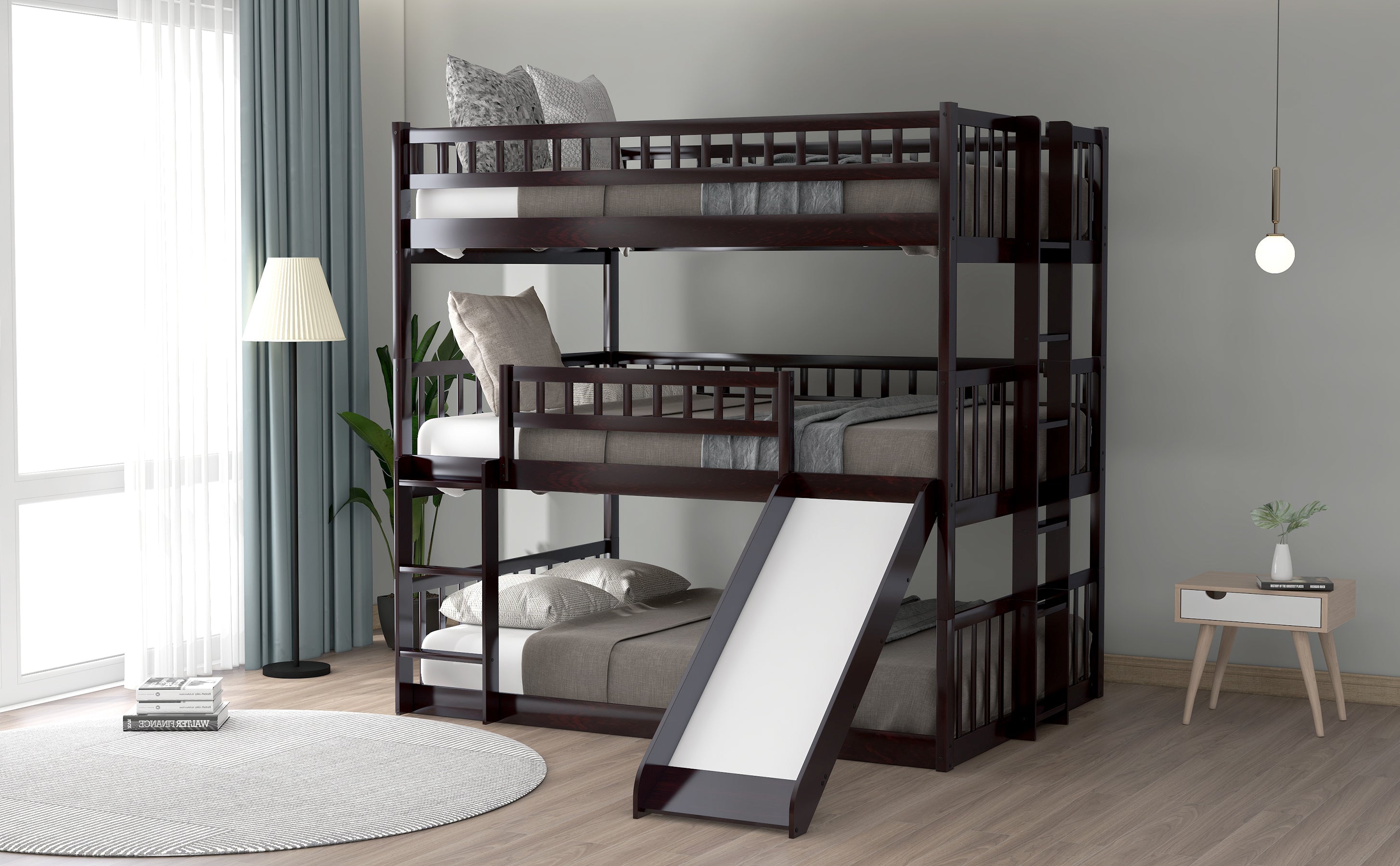 Full-Over-Full-Over-Full Triple Bed with Built-in Ladder and Slide, Triple Bunk Bed with Guardrails, Espresso