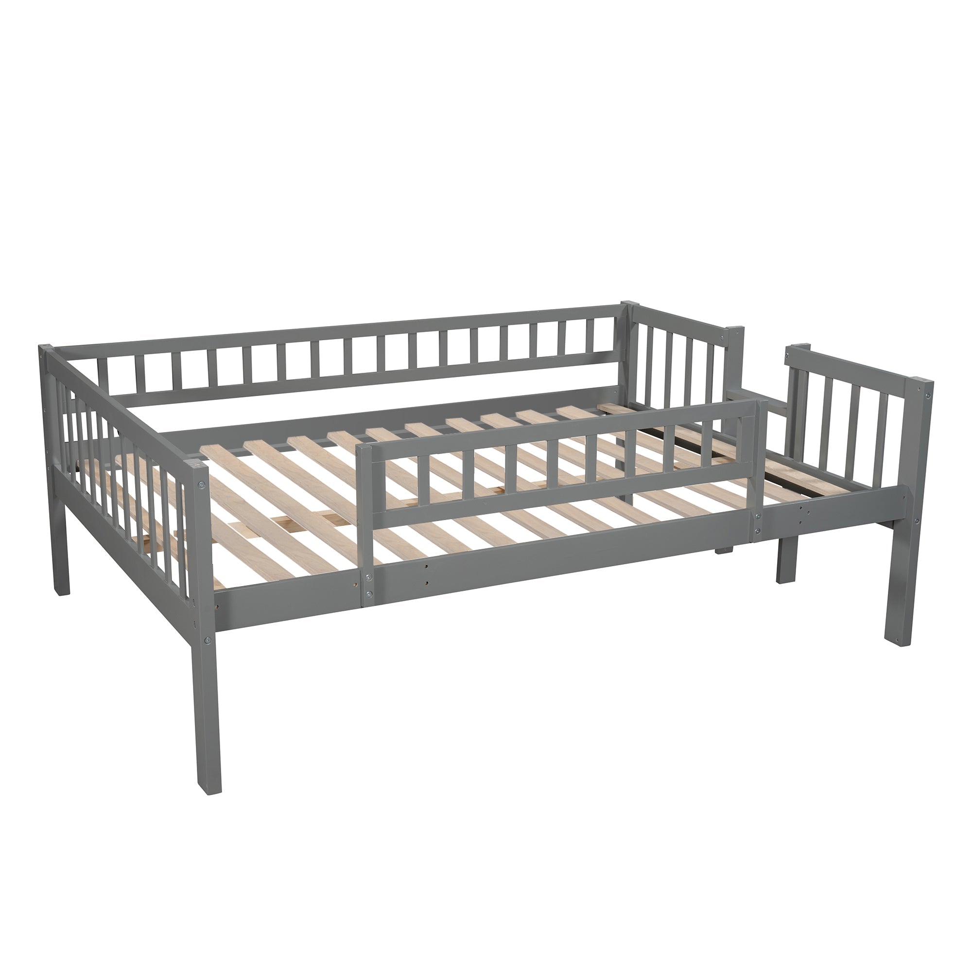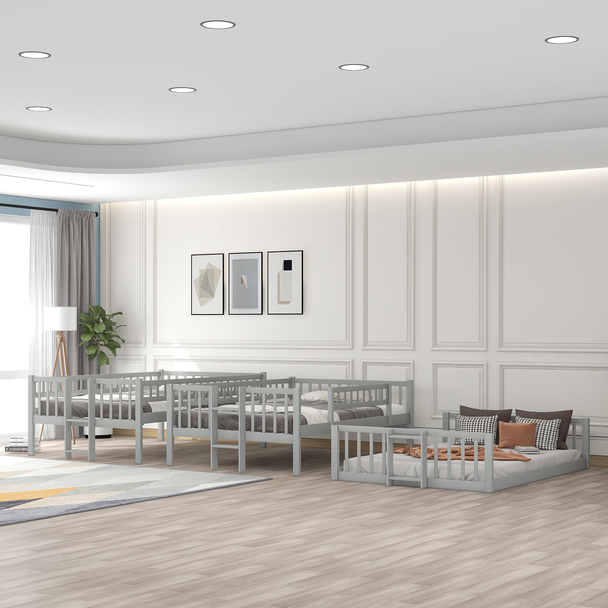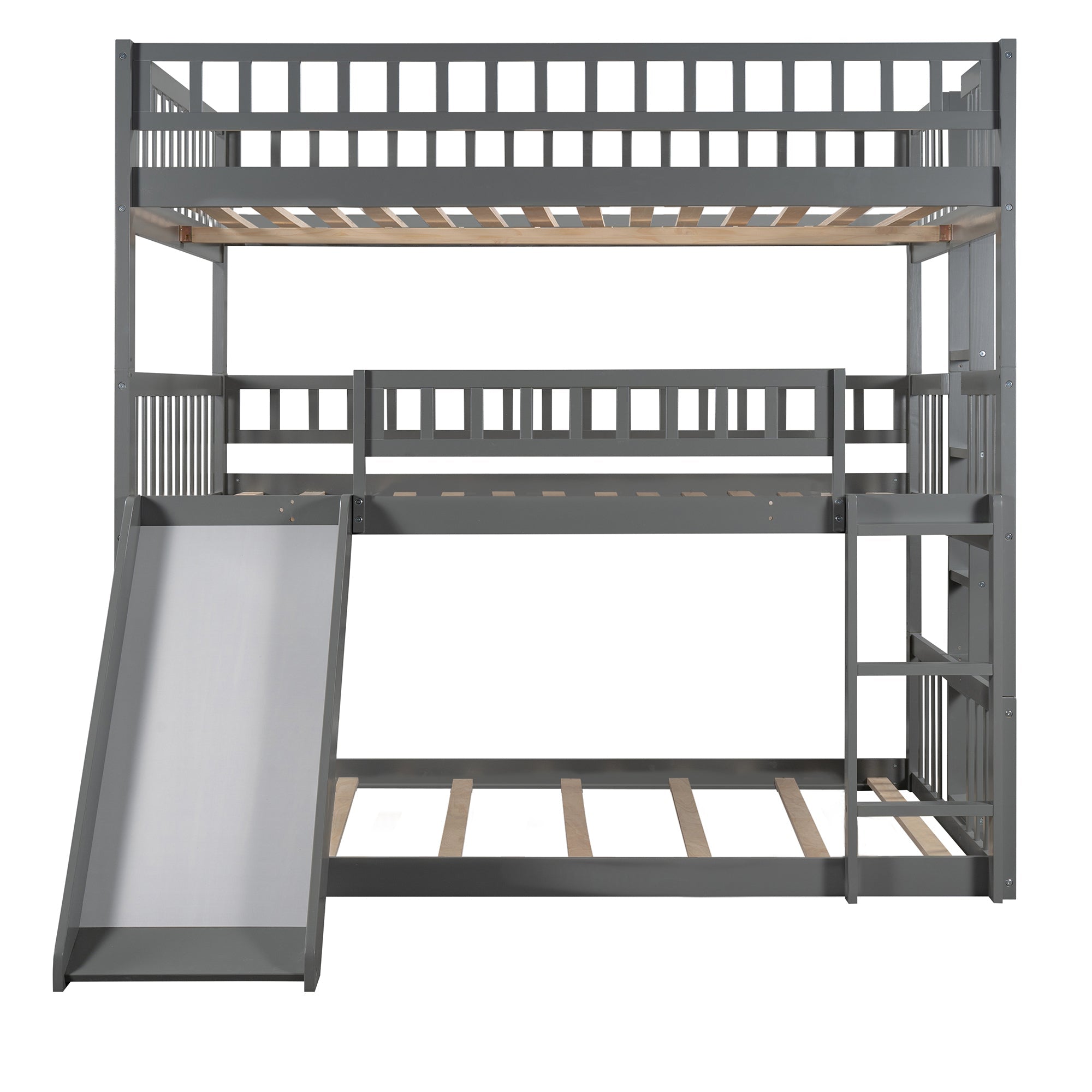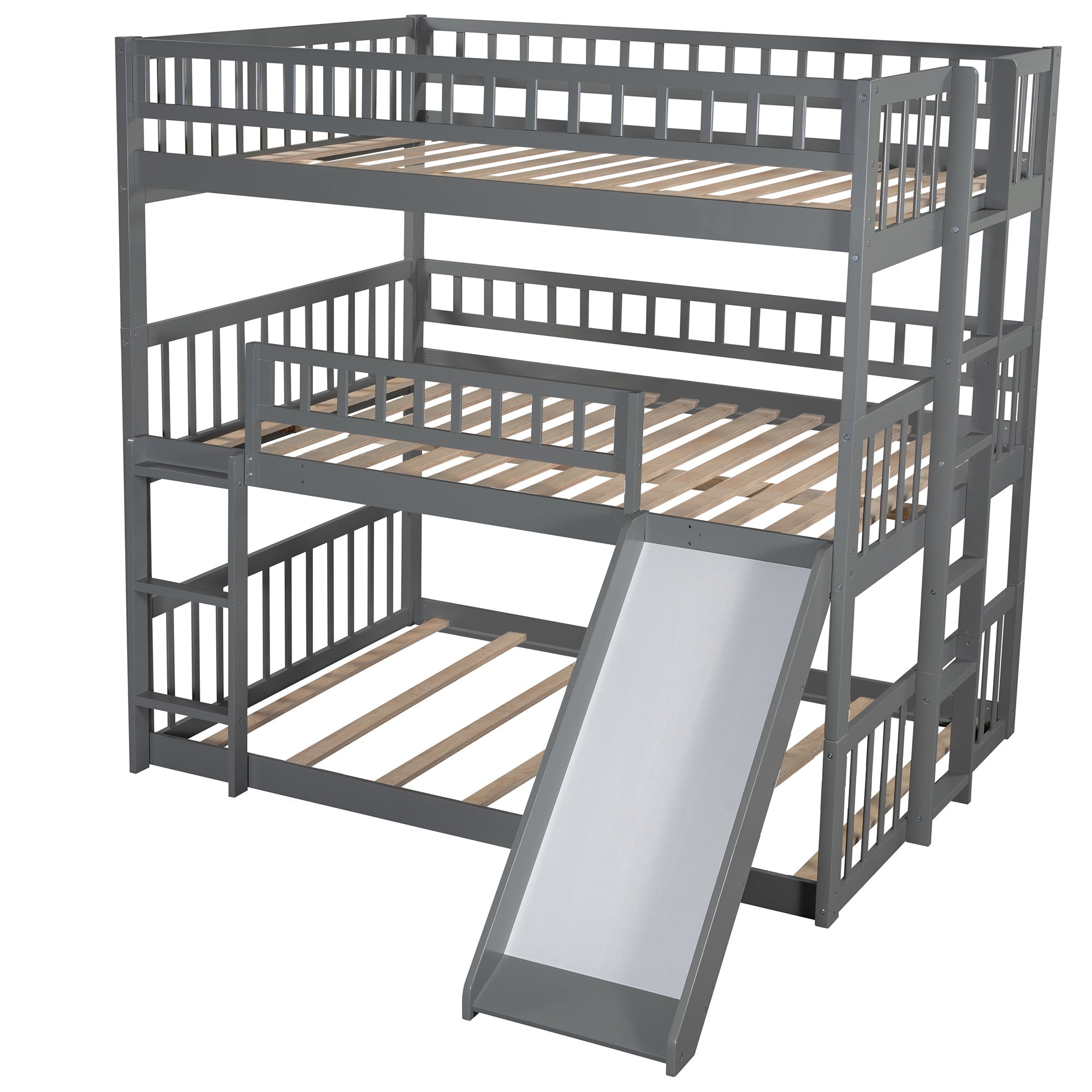Featuring a full-over-full-over-full structure, this triple bed provides a convenient and flexible arrangement option for large families and sleepovers by taking advantage of vertical space. A gray finish enhances the smooth lines and add a contemporary feel to any room set aside for multiples to sleep. Crafted with pine wood and plywood, this triple bed is sturdy and durable to withstand the test of time. You can easily access the upper and middle bunks with two built-in ladders. Sturdy guardrails protect you as you sleep through the night. The specially designed slide can meet the play needs of you and develop you balance ability. This set works perfectly as a stacked full-over-full-over-full unit, or divided into three separate full beds. You can choose the combination method based on your own needs.