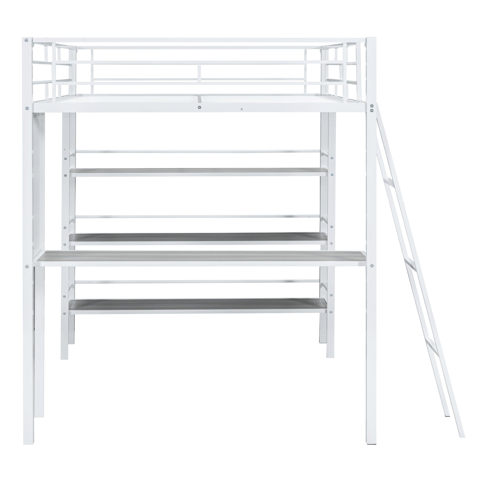 Crafted of metal in a clean painted finish, this metal loft bed strikes a clean-lined silhouette with slatted guardrails.The 3-layers open shelves offer you such space to lay out whatever you want.Equipped with a large desk and whiteboard underneath, this bed definitely offers you a comfortable place to work, read and enjoy yourself.This loft bed will be a beautiful and practical piece in your bedroom.