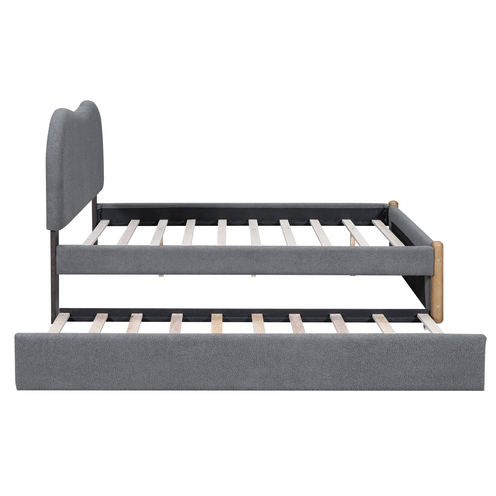 This platform bed with a arc-shaped headboard adds a warm feel to your bedroom. Gray/White Berber Fleece finish, warm and comfortable, suitable for any home style. The extra trundle bed is perfect if you’re hosting guests for the night.