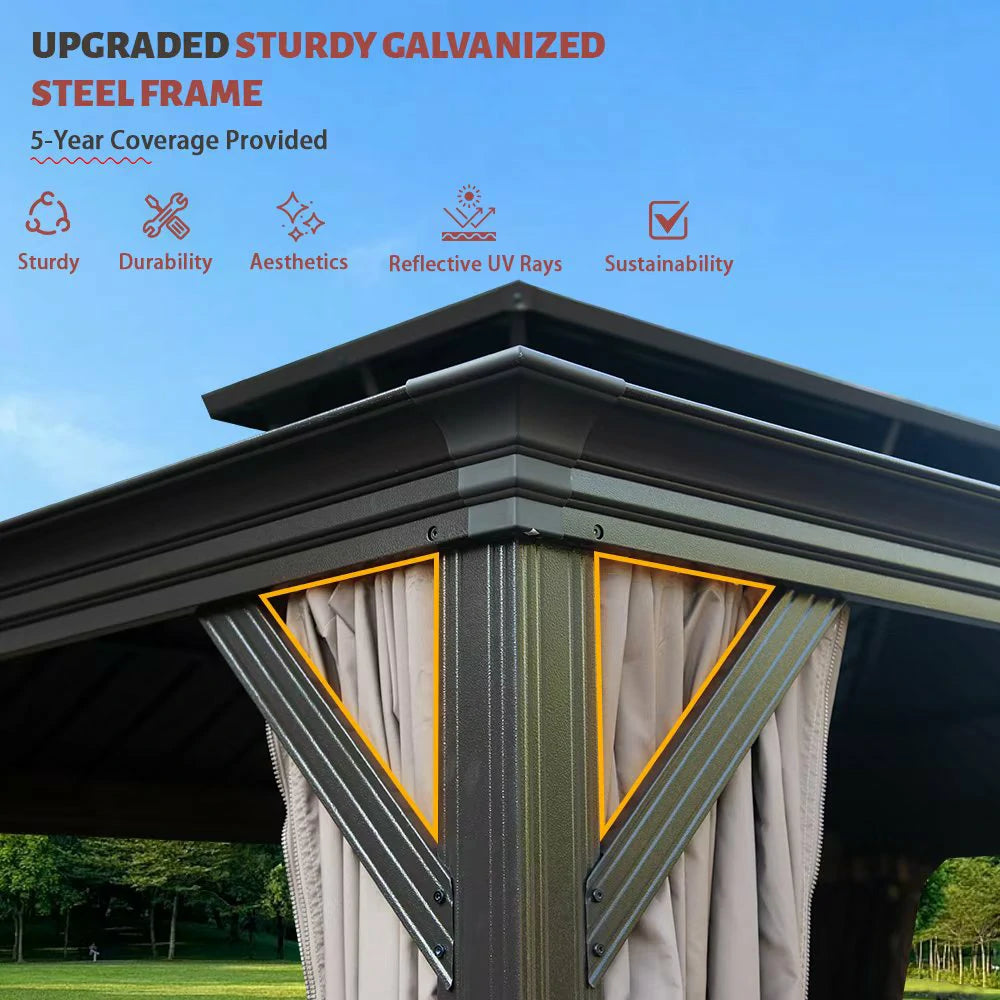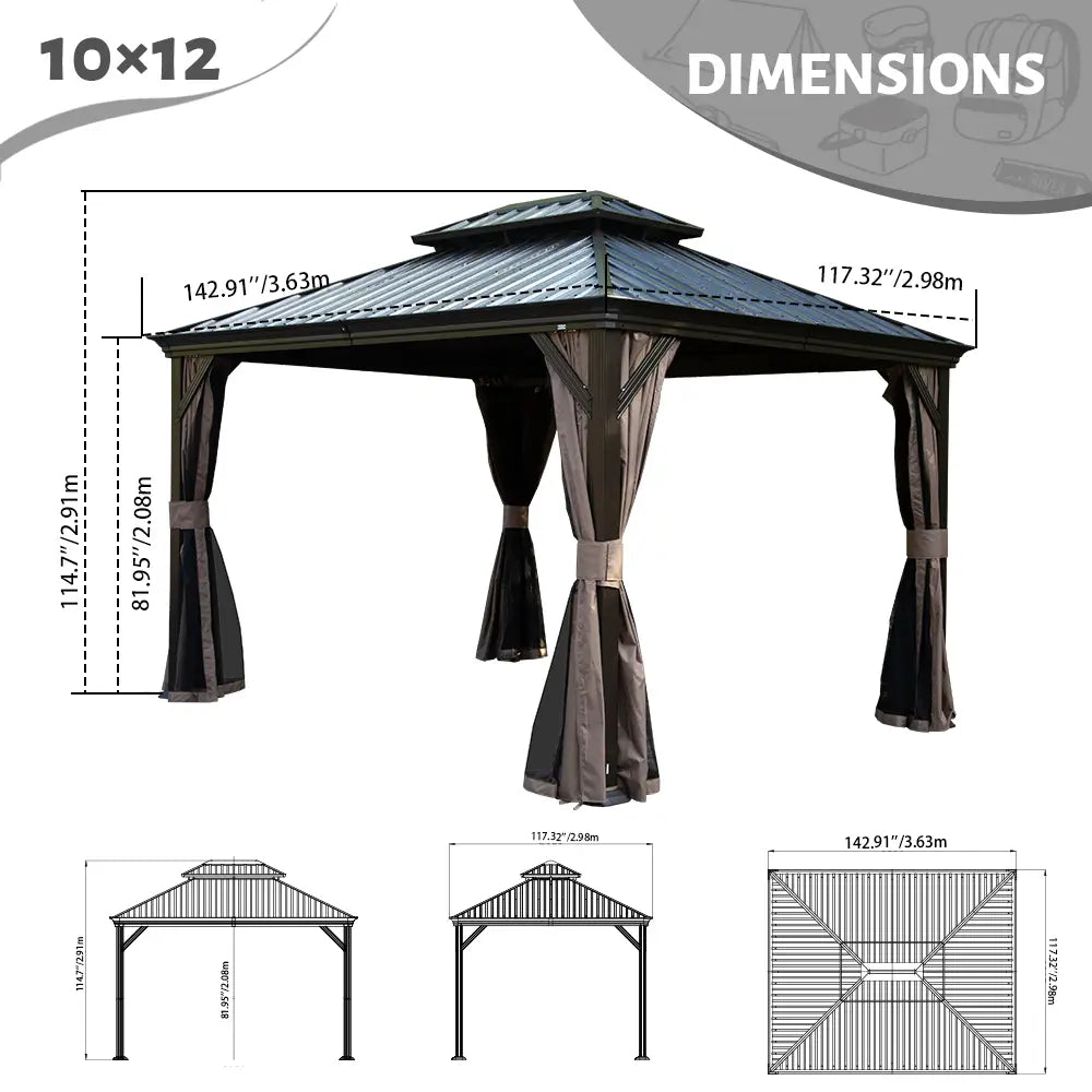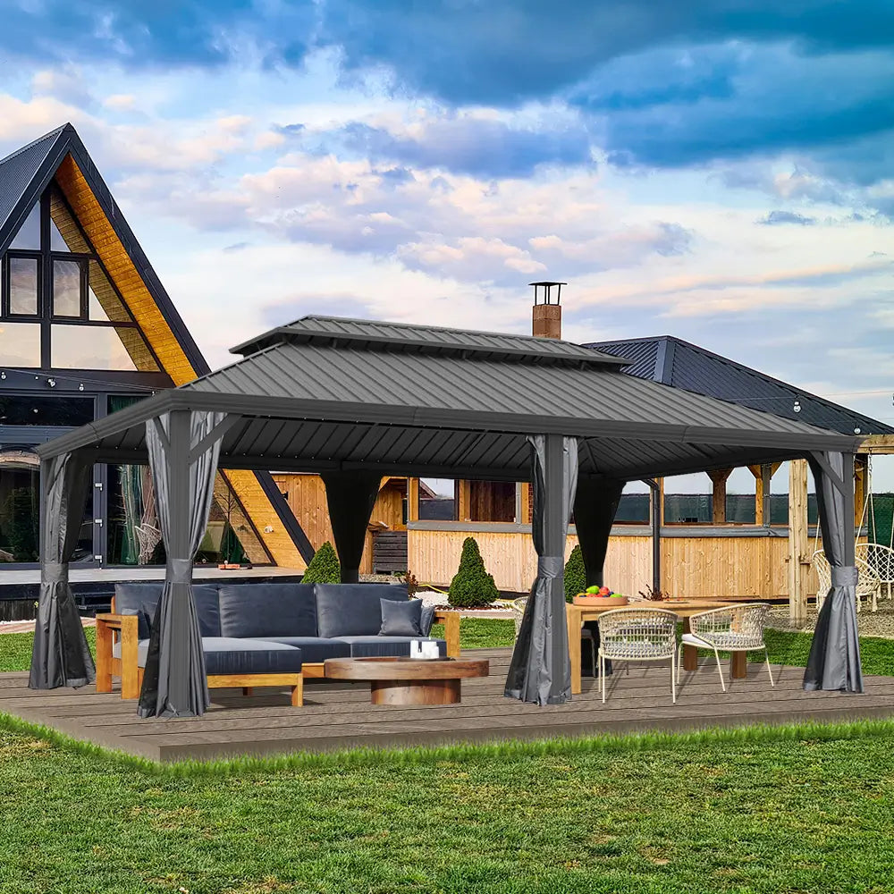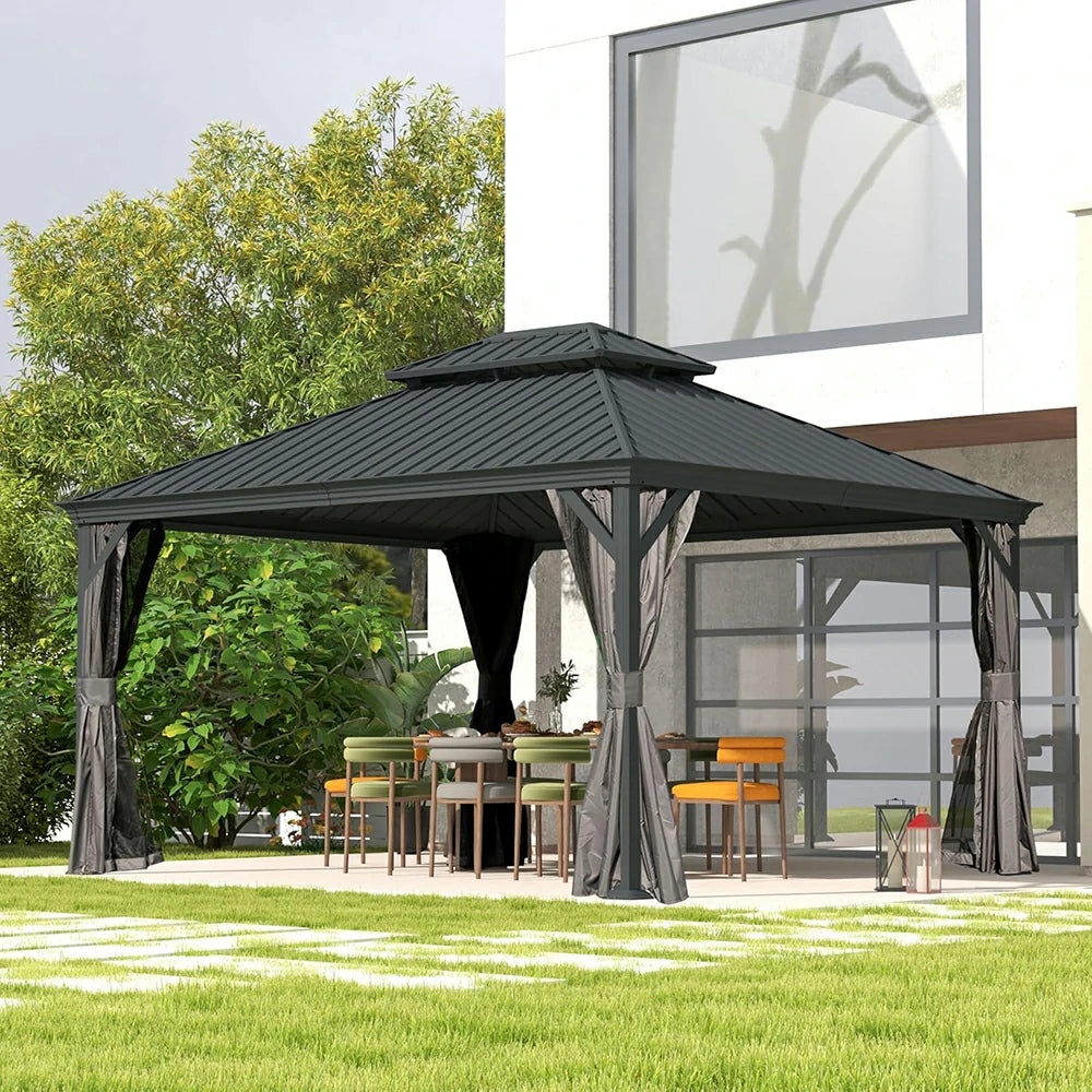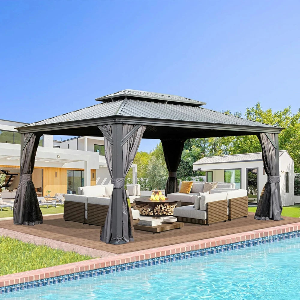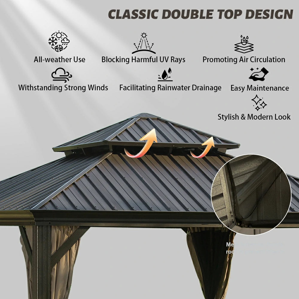 Our hardtop gazebo features a double roof design for enhanced airflow, UV protection, and weather resistance. A built-in mesh layer keeps insects out while allowing fresh air to circulate, creating a comfortable and bug-free outdoor space.