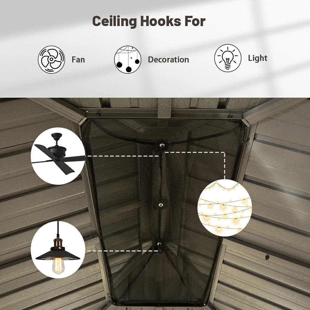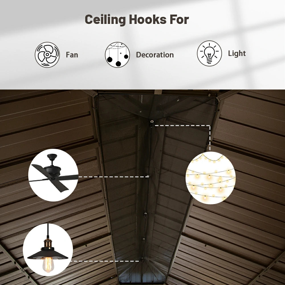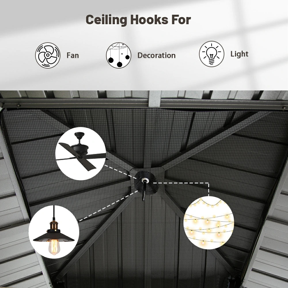 Stay protected with our hardtop gazebo featuring an upgraded one-piece mesh for superior mosquito protection. Designed for versatility, the built-in ceiling hooks let you easily add a fan, lighting, or decorations, creating a stylish and comfortable outdoor retreat. Perfect for day and night enjoyment!