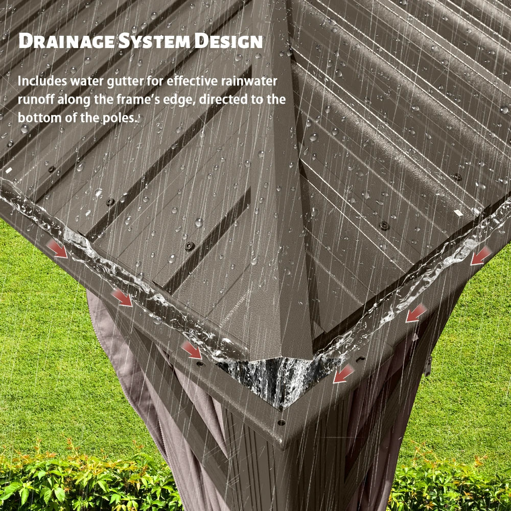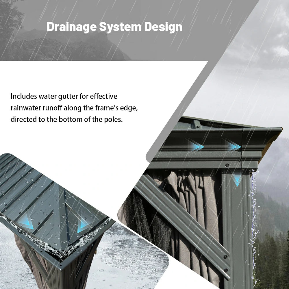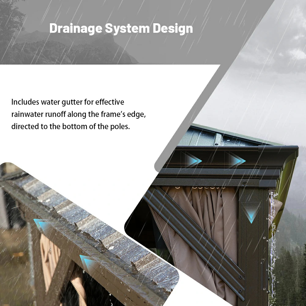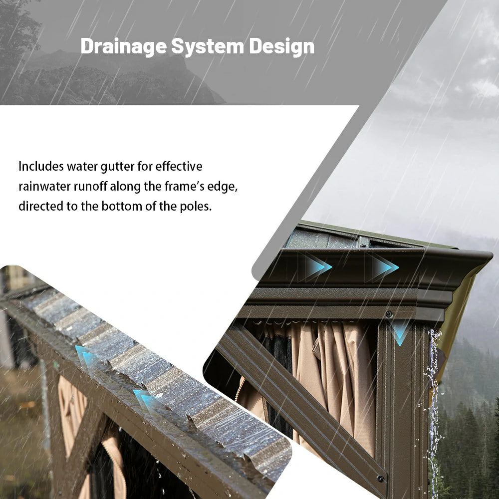 Upgrade your outdoor space with our hardtop gazebo, designed for all-weather comfort. Featuring an advanced gazebo with gutters, this structure efficiently channels rainwater from the roof eaves to the ground, keeping your patio dry and enjoyable even during unexpected showers. No more worrying about the weather.