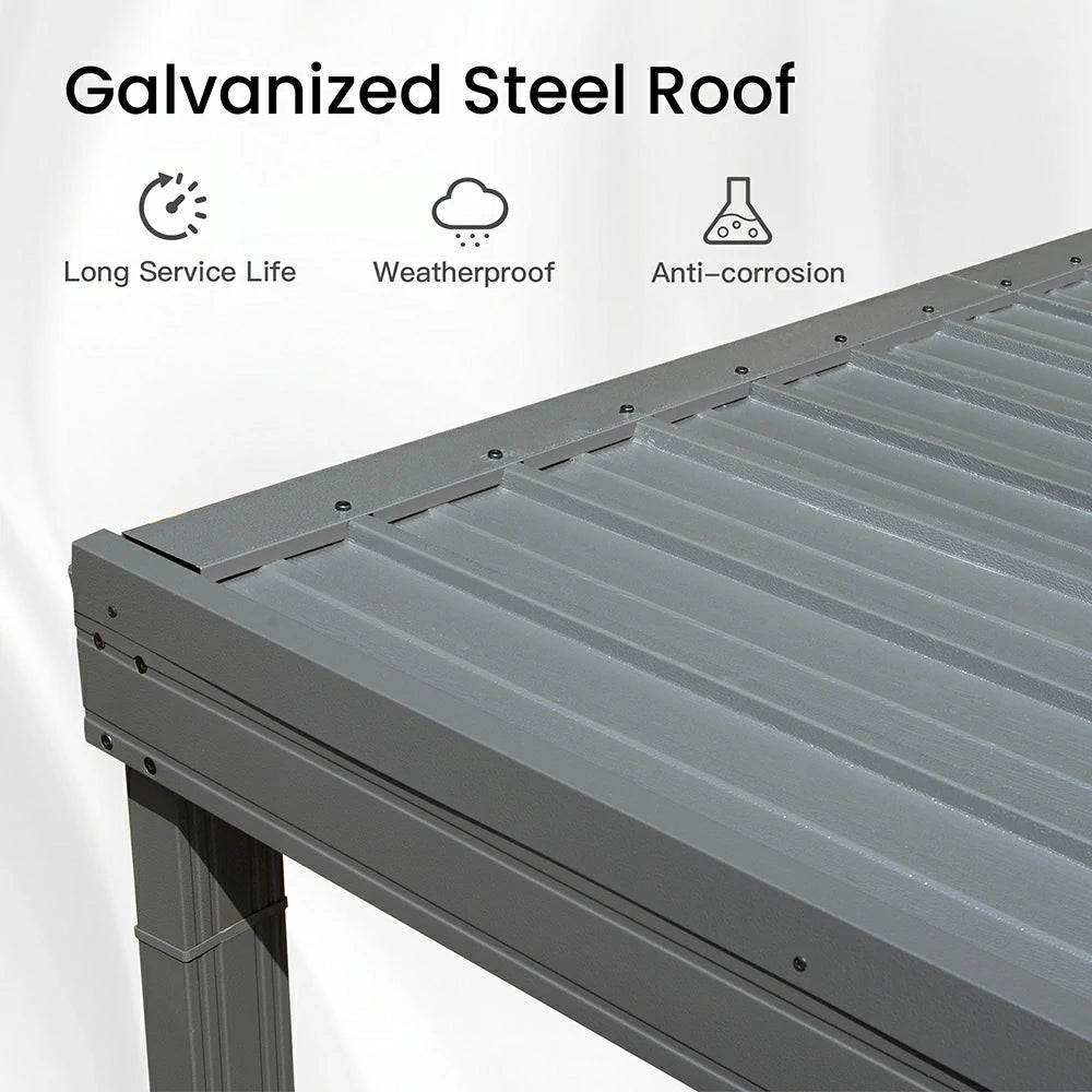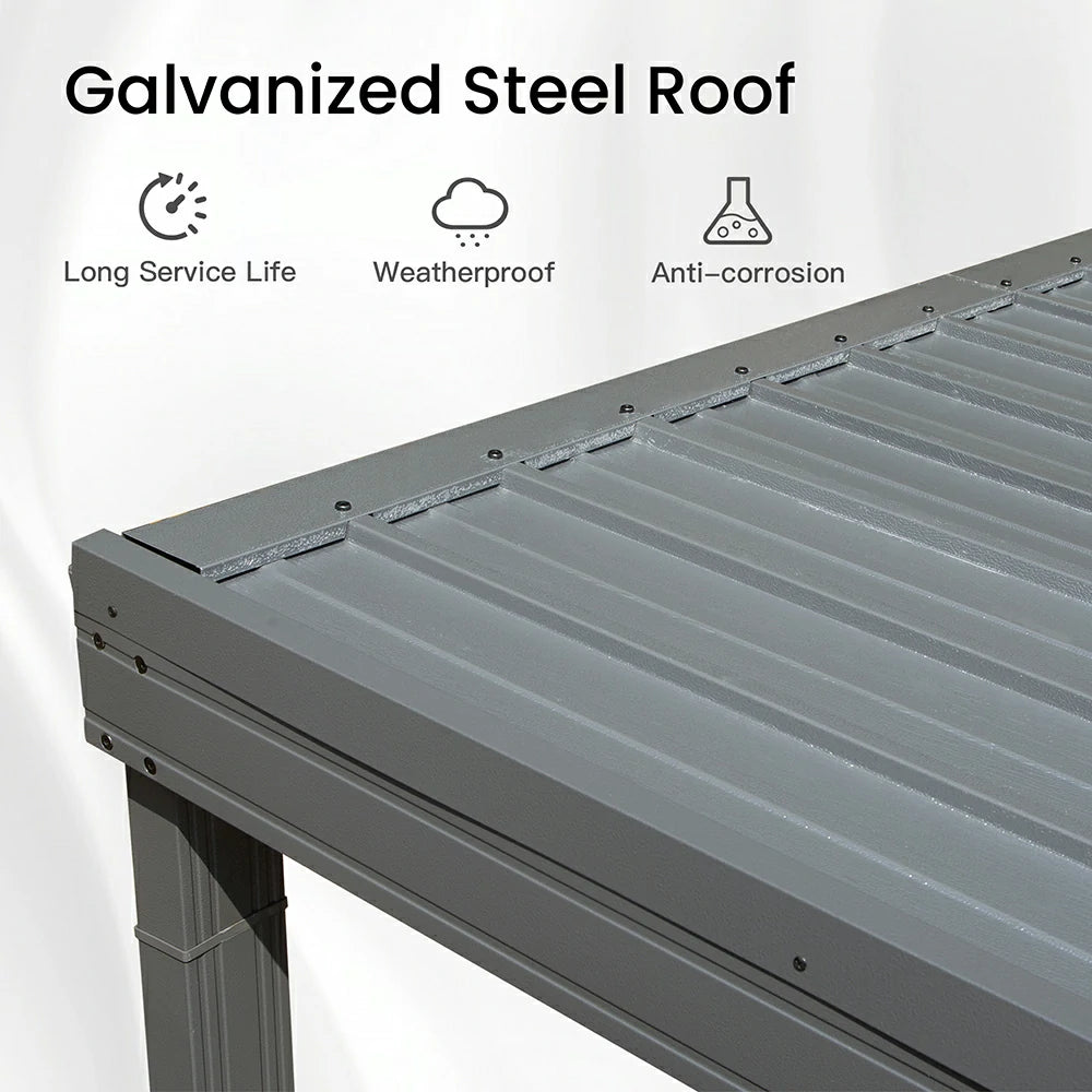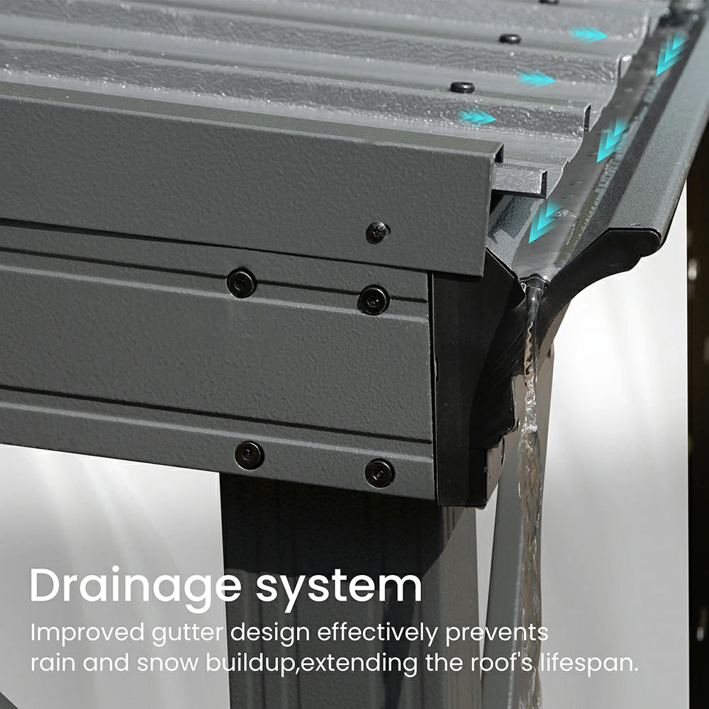 The Lean-to Gazebo features a sloping galvanized steel roof that not only enhances the visual appeal but also ensures efficient water drainage. Gutters are designed at the front of the roof to collect rainwater to run down the posts. The modern design blends seamlessly with any outdoor aesthetic, adding an element of sophistication to your space.