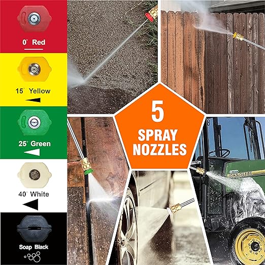 - Red Nozzle: 0-Degree for a concentrated, high-pressure stream