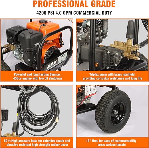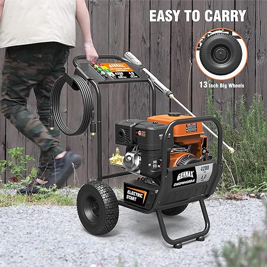 When it comes to tackling tough cleaning tasks with speed and precision, the Genmax GMGPW4200-A Gas Pressure Washer stands in a league of its own. With an impressive 4200 PSI (pounds per square inch) of pressure and a remarkable flow rate of 4 GPM (gallons per minute), this powerhouse is designed to make dirt, grime, and stains disappear with ease. Here’s why the GMGPW4200-A should be your top choice: