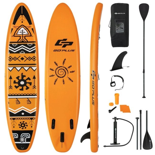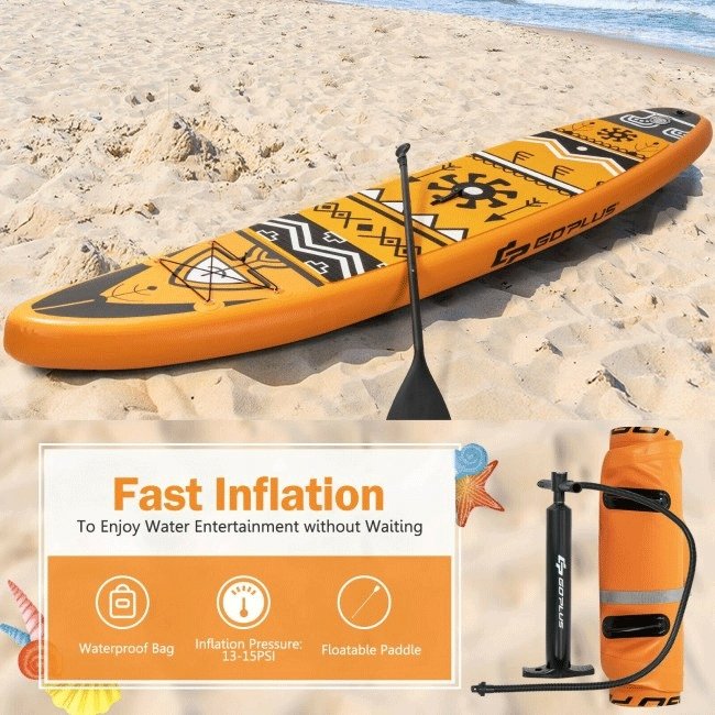 This inflatable stand-up paddle board is ideal for water activities, such as padding, water yoga, fishing and water sunbathing. It can quickly be inflated with the included hand pump and deflated with a valve wrench. This way, you can pack the inflatable SUP with other accessories into a carrying bag.