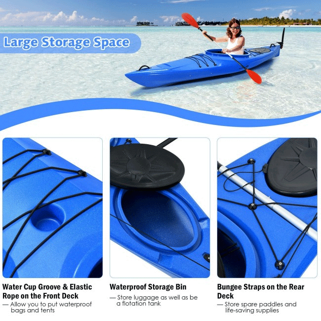 Designed with special high strength LLDPE material, the 1-person sit in kayak has enough room to support one person and weighs only about 48 lbs, making it extremely portable. Plus, the unique detachable rudder design makes sailing in strong current much easier.