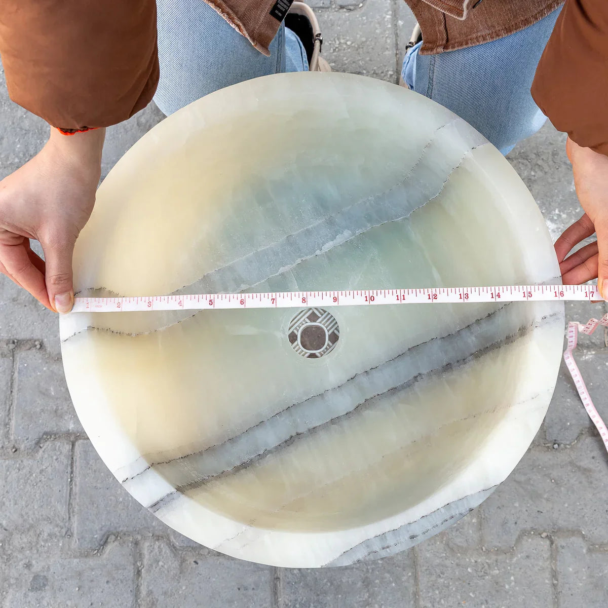 The combination of a smooth, polished interior and chiseled exterior ensures this vessel sink will be the focal point of your bathroom decor. The breathtaking onyx from the Turkey will blend into any setting. These bowl sinks for bathrooms are not only convenient for everyday use, but also an ornament for your living space. The artisanal construction ensures that no two sinks will be exactly identical. The polished interior is perfectly paired with a unique textured exterior for a tactile experience. Hand carved natural onyx construction. Side to side Diameter: 16inches, Sink depth 6 inches, Drain hole 1.5 inches. Its curved edges and smooth construction facilitate the cleaning and maintenance of this sink bowl. Not easy to produce cracks, refused to dirt deposition, durable and not deformed. No overflow and very resistant to drains. Vessel bowl sink installs above the counter for a modern look that is sure to complement bathrooms of any design, whether they are modern, contemporary, traditional or transitional. To clean, add a few drops of mild cleanser, rinse with water and wipe dry.