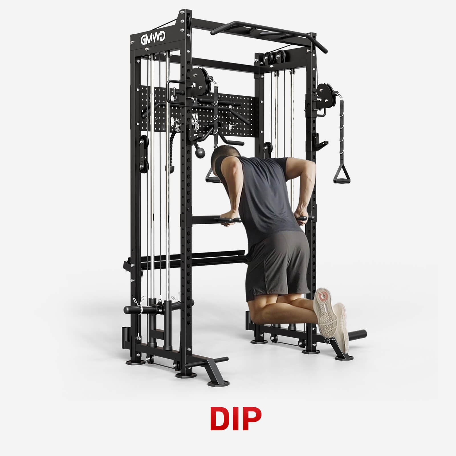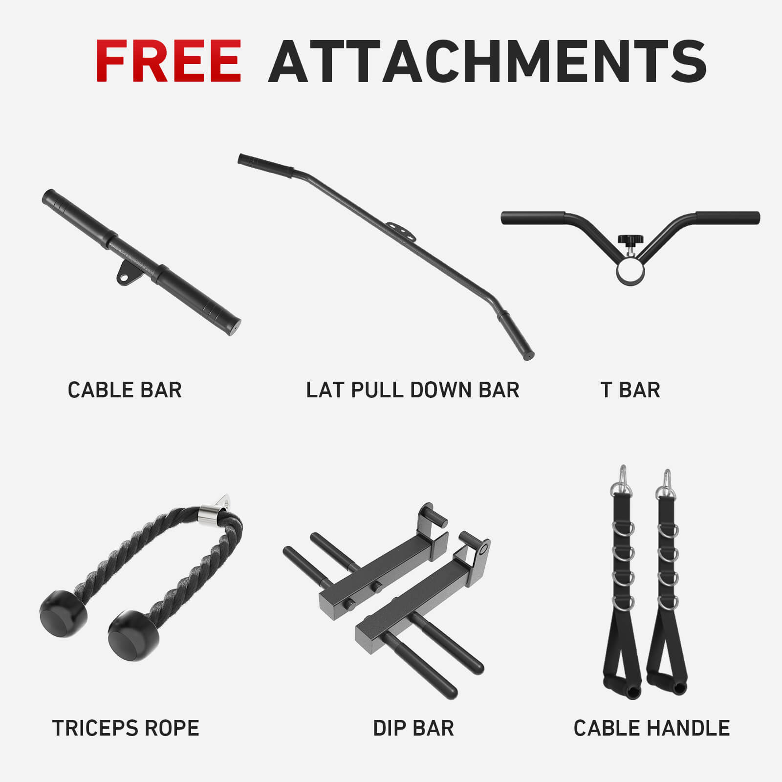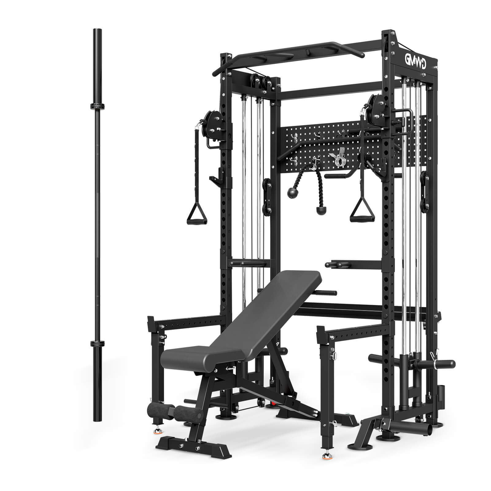 This machine includes a comprehensive set of attachments—dip handles, T-bar, tricep rope, lat pull down bar, cable handle, and more—enabling users to target various muscle groups and expand exercise possibilities. To keep the workout area neat, the HR01 is equipped with a pegboard, dumbbell rack, and dual barbell holders, ensuring essential gear stays organized and within reach.