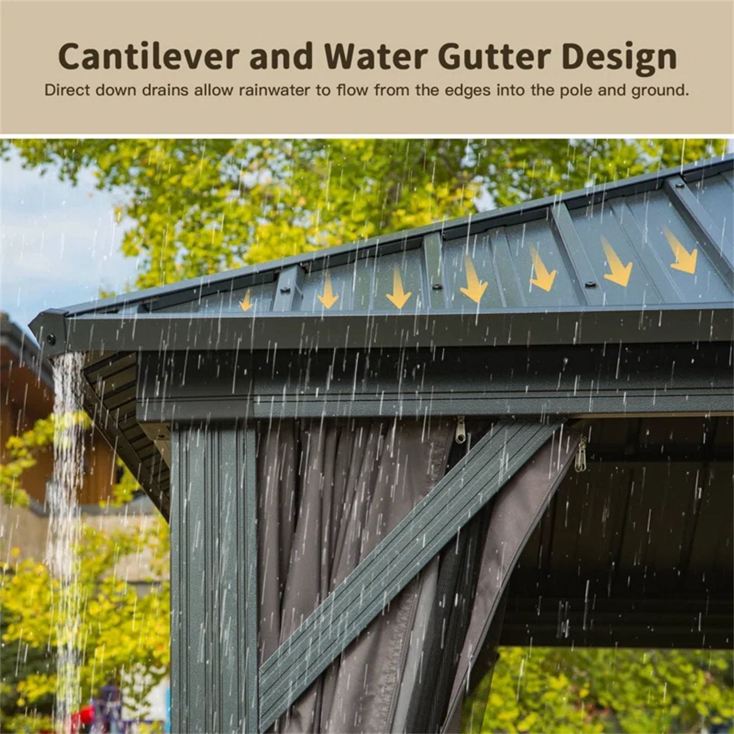 • EXCELLENT WATER GUTTER: Water gutter design collect the surface water of roof and direct it to four corners, and then flows alone the pillars,The unique and targeted design keeps the gazebo in good condition and prolongs its lifespan.