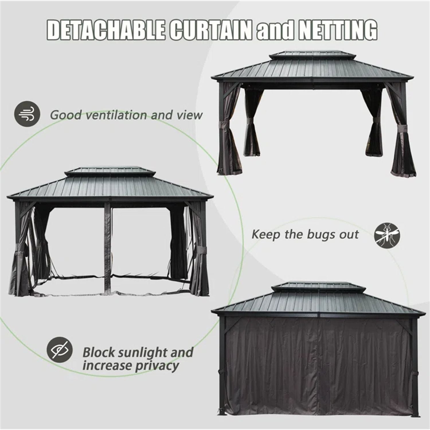 • GALVANIZED STEEL DOUBLE ROOF: W12ftxL16ft(144inchx192inch), Fade-resistant and rust-resistant galvanized steel top, keeps out bright light and harmful UV rays, strong enough to withhold windy or heavy snow. which is not possible with traditional soft top gazebos.