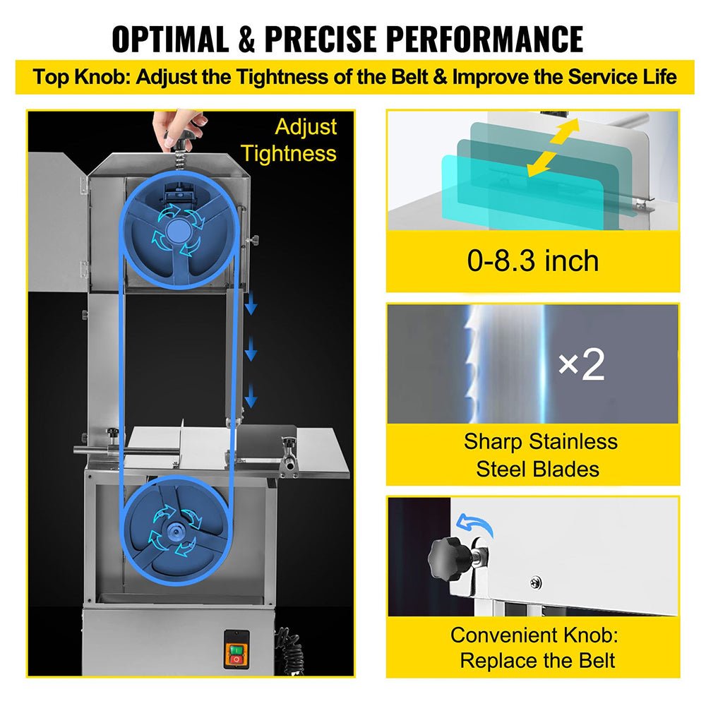 • This commercial electric meat and bone bandsaw machine boasts 2 high-grade stainless steel saw blades that are both sharp and reliable — perfect for quick and easy replacement. Plus, with the included blade tension adjustment knob, you can adjust the intensity to your heart’s content!
