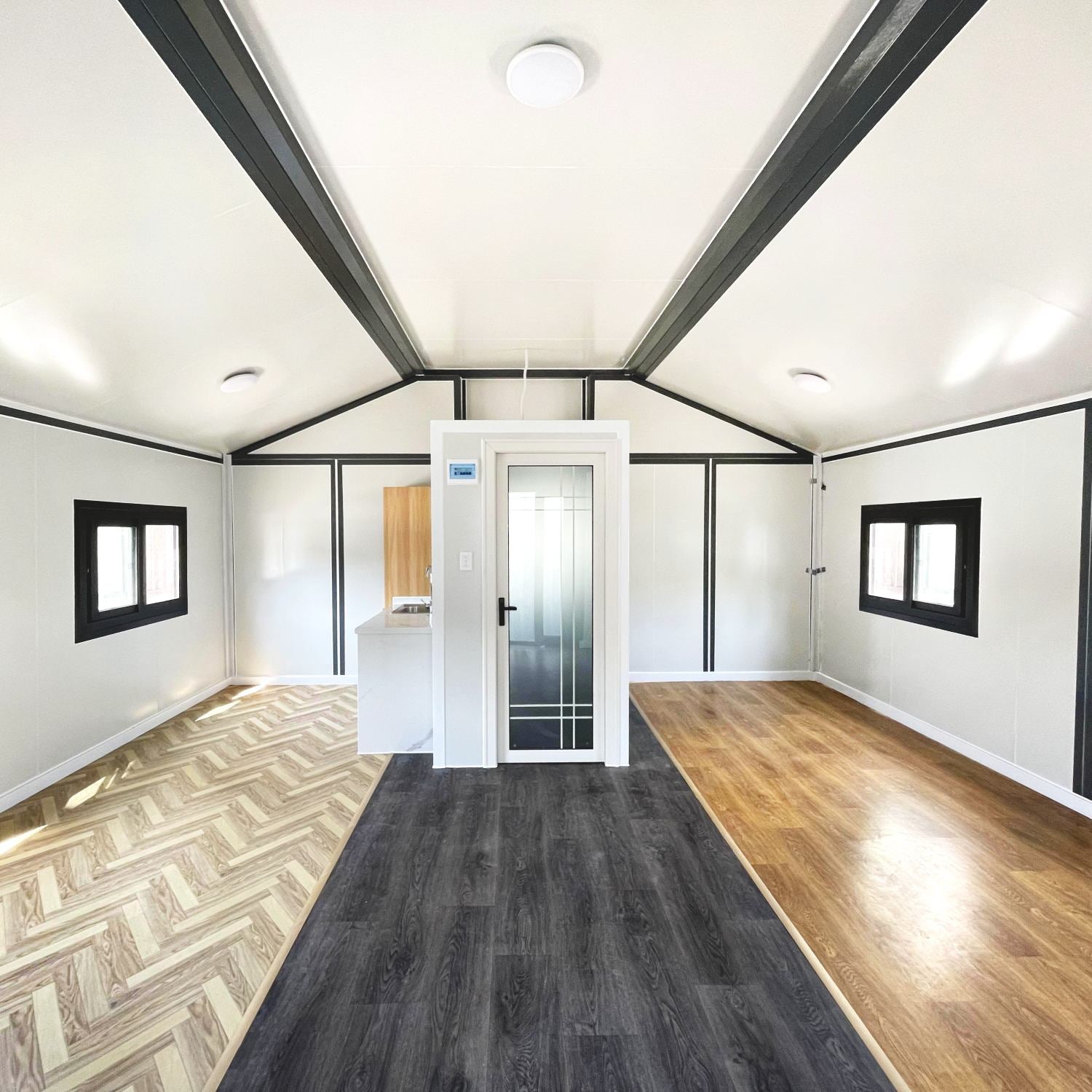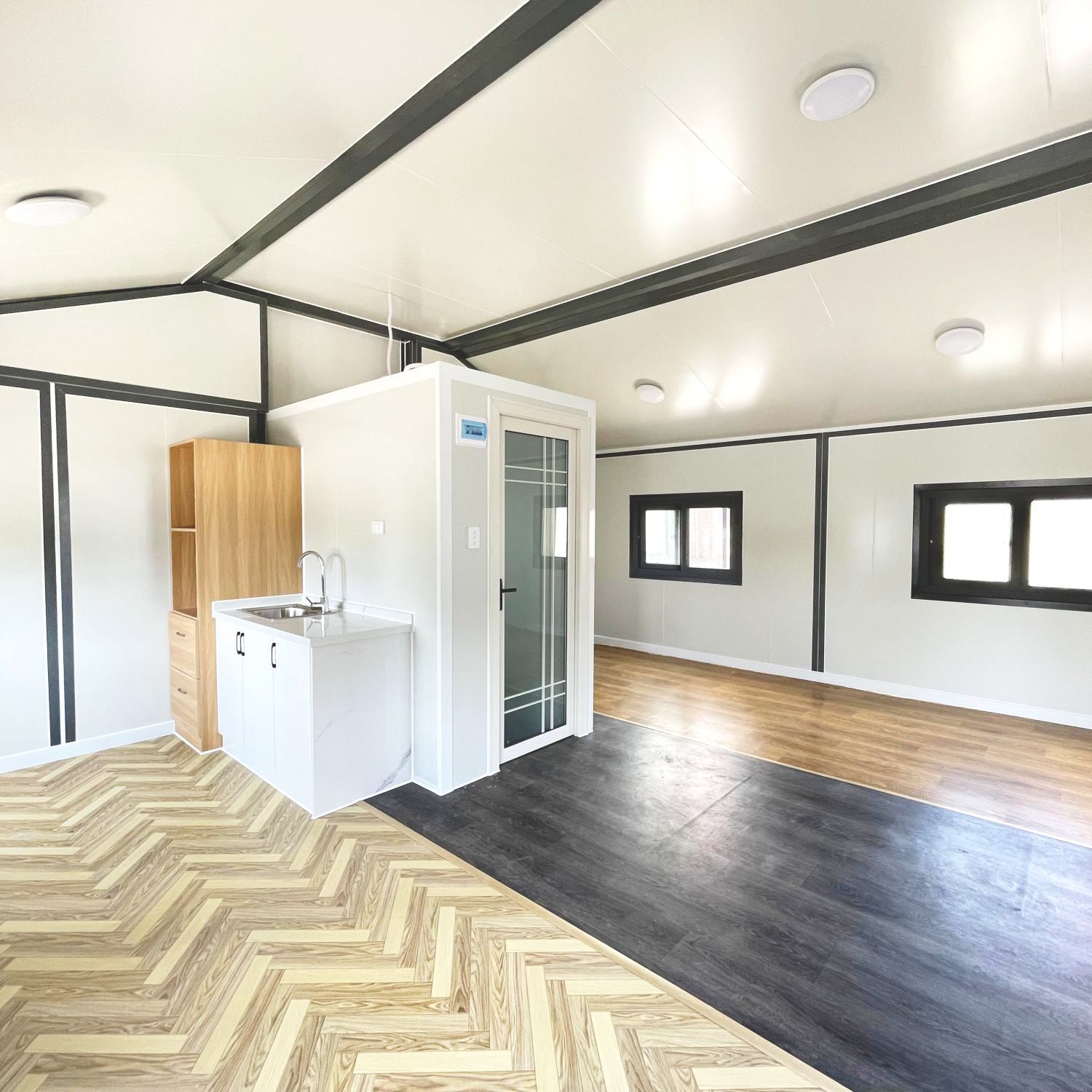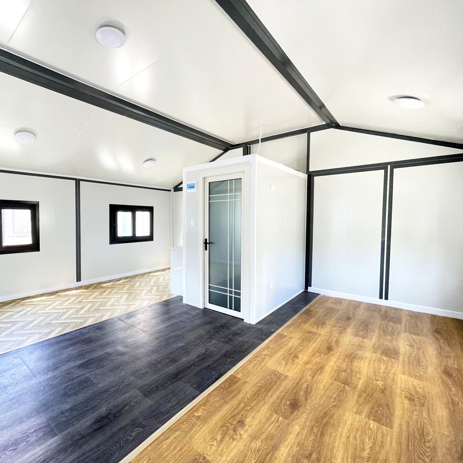 Experience spacious living with this innovative container home. Featuring 7.5ft solid exterior walls and a unique lift-top roof that expands to a 10.9ft peak height, maximizing vertical space. The transformable design creates an airy, open interior perfect for a workspace or living area. Engineered for durability and modern aesthetics, it combines industrial strength with adaptable comfort. Ideal for those seeking a high-ceiling solution without compromising structural integrity.
