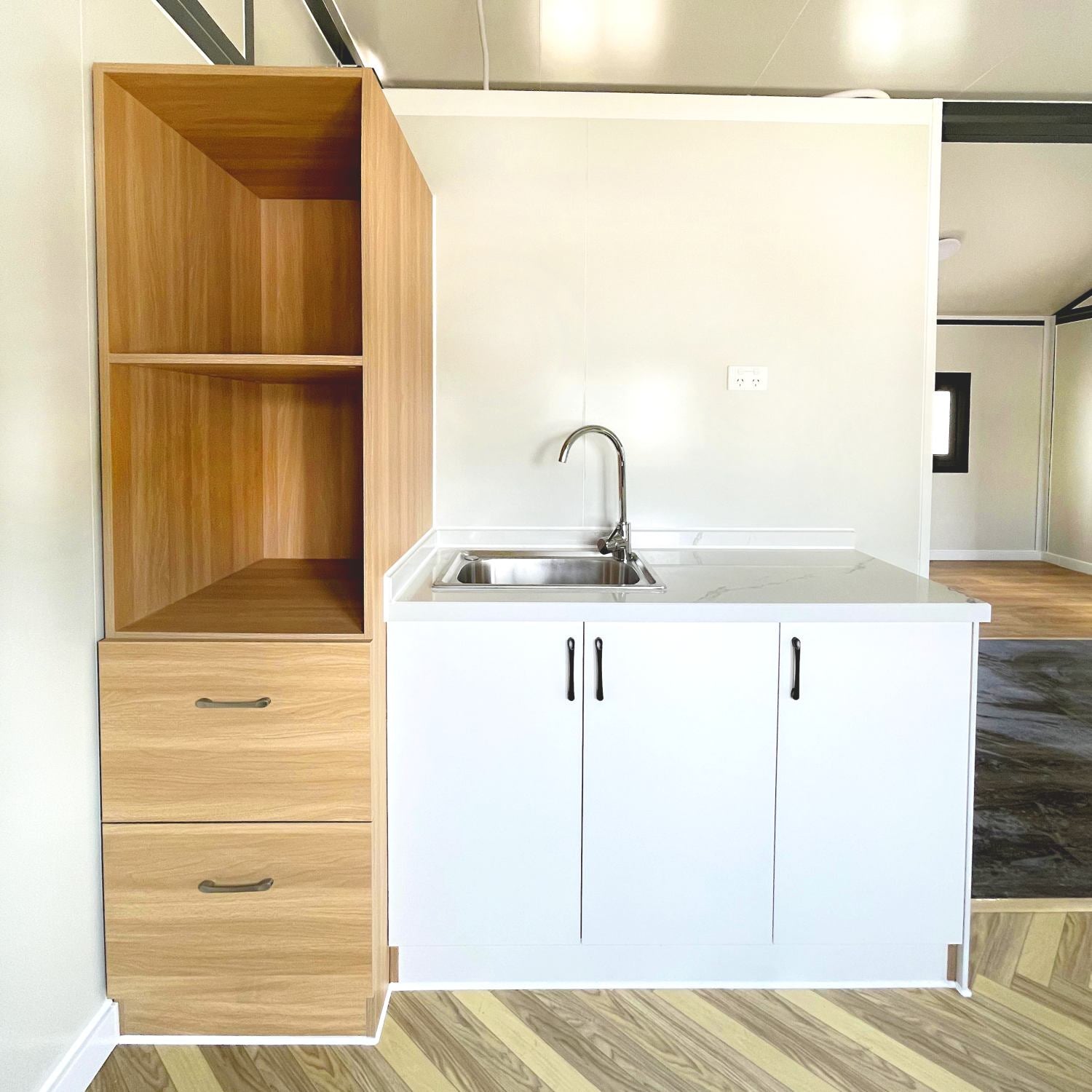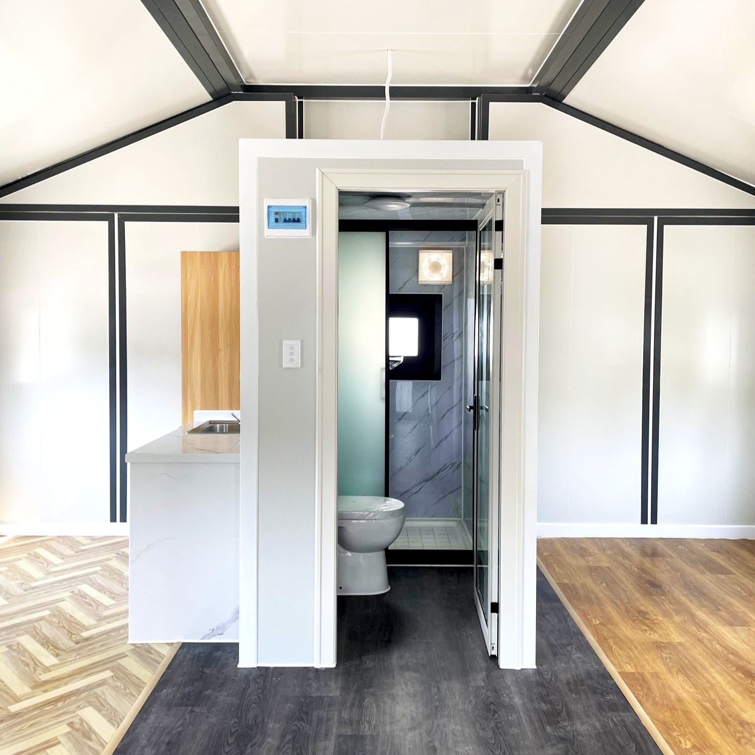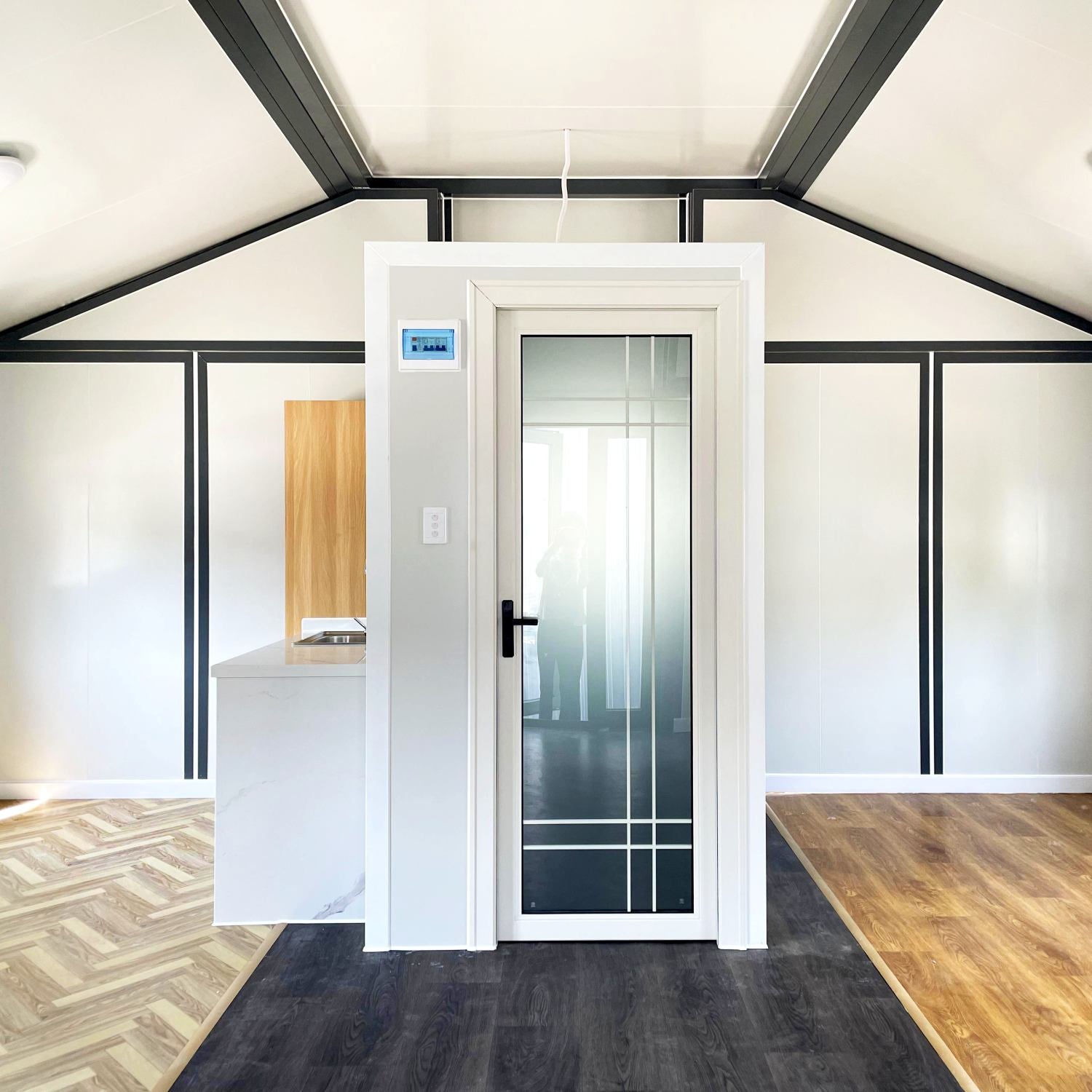 Experience spacious living with this innovative container home. Featuring 7.5ft solid exterior walls and a unique lift-top roof that expands to a 10.9ft peak height, maximizing vertical space. The transformable design creates an airy, open interior perfect for a workspace or living area. Engineered for durability and modern aesthetics, it combines industrial strength with adaptable comfort. Ideal for those seeking a high-ceiling solution without compromising structural integrity.