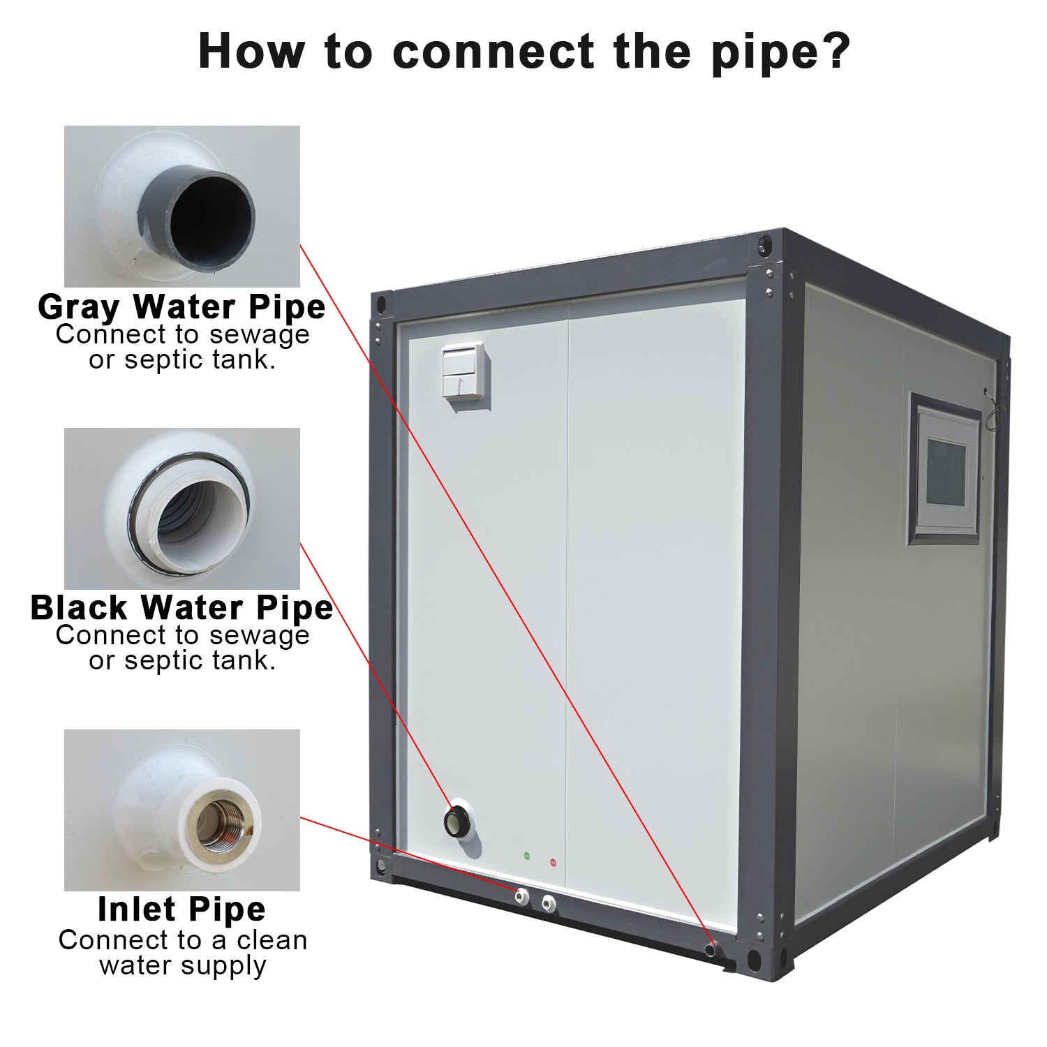 If this Portable Restroom w/ Showers is used on a construction site, we recommend you connect toilets to the sanitary sewer system and connect water to the pipe system. If not, you may need tanks outside the structure for waste.