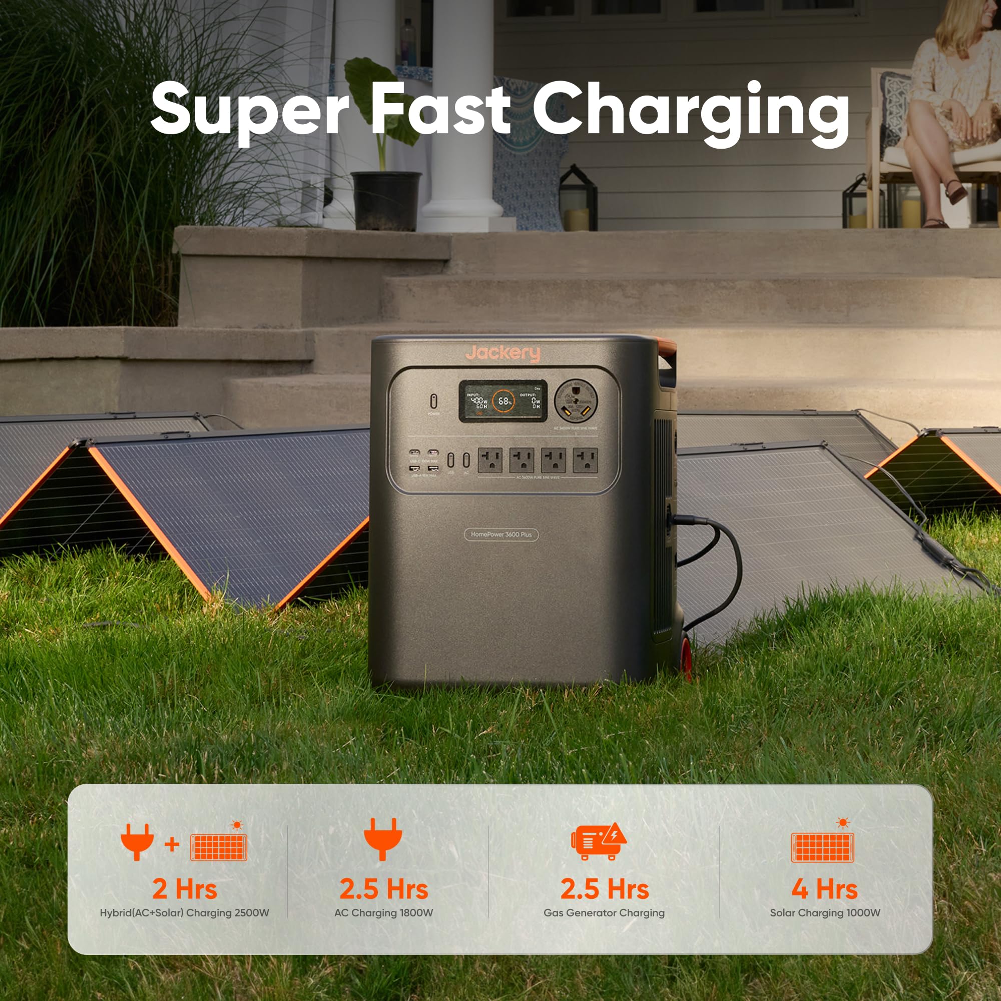 - 4 Charging Options: With 4 convenient ways to charge, the Jackery HomePower 3600 Plus solar generator can be fully recharged from 0–100% in just 2 hours via hybrid AC+DC. It also supports charging via AC in 2.5 hours, solar in 4 hours, or a gas generator in 2.5 hours —delivering a full day of quiet, clean energy.