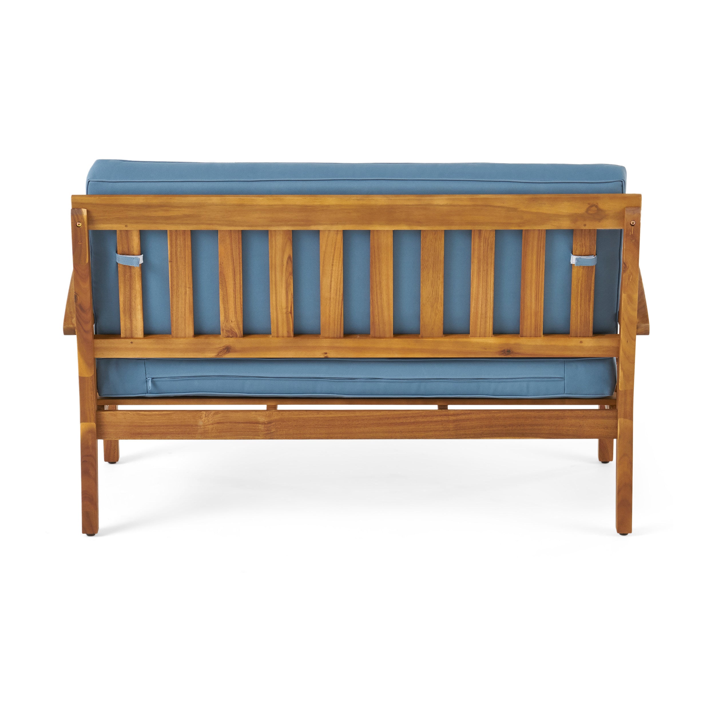 - The water resistant cushions in conjunction with the wood make both the loveseat and table ideal for an outdoor setting.