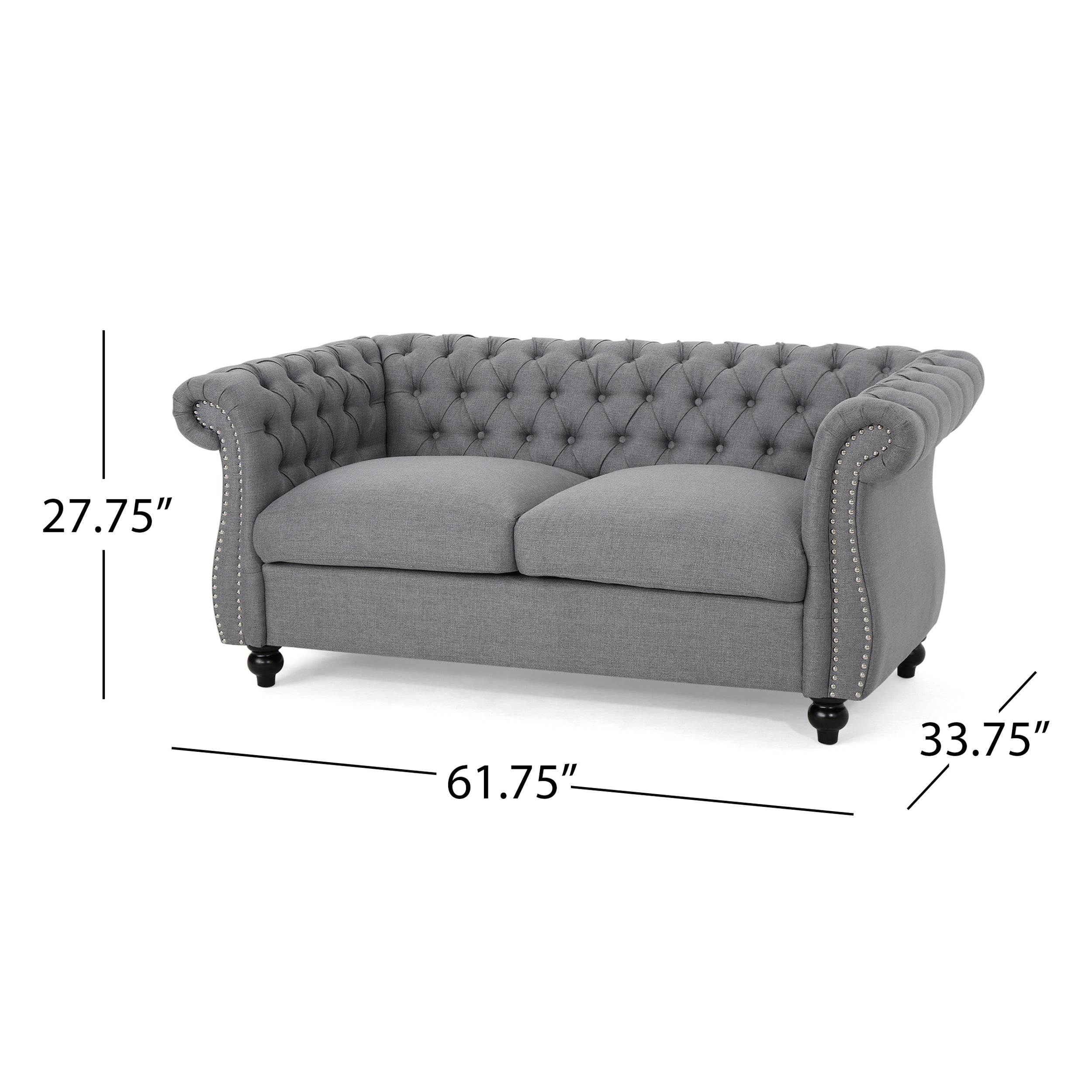 - DIMENSIONS: This loveseat is 61.75″ W x 33.75″ D x 27.75″ H.
