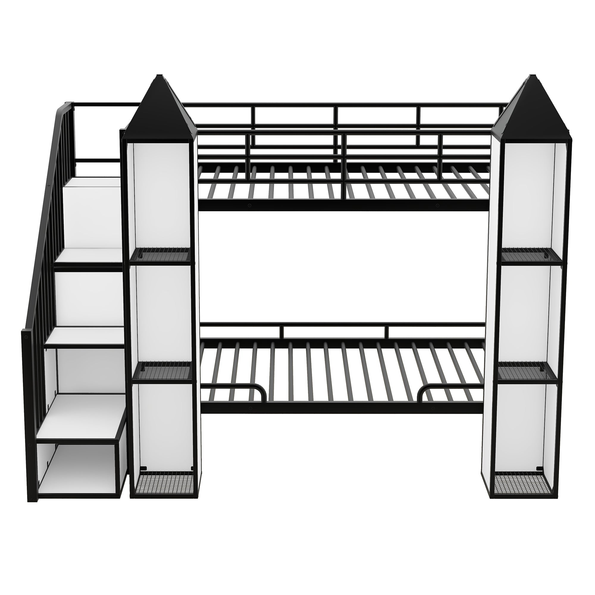Metal Twin over Twin Castle-shaped Bunk Bed with Wardrobe and Multiple Storage, Black+White