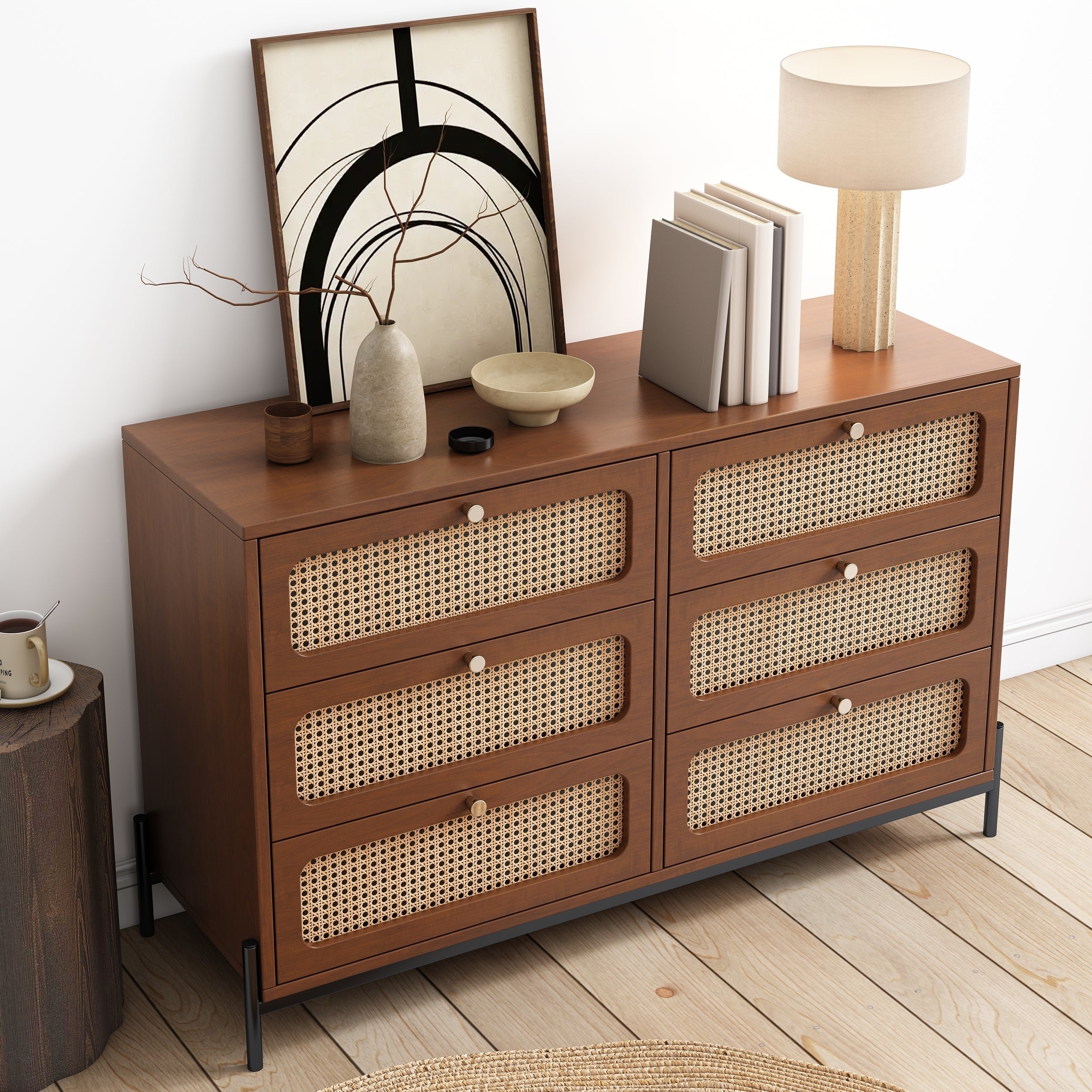 Modern Cannage Rattan Wood Closet 6-Drawer Dresser Wood Storage Cabinet Sideboard for Bedroom, Living Room, Entryway, Hallway, Walnut
