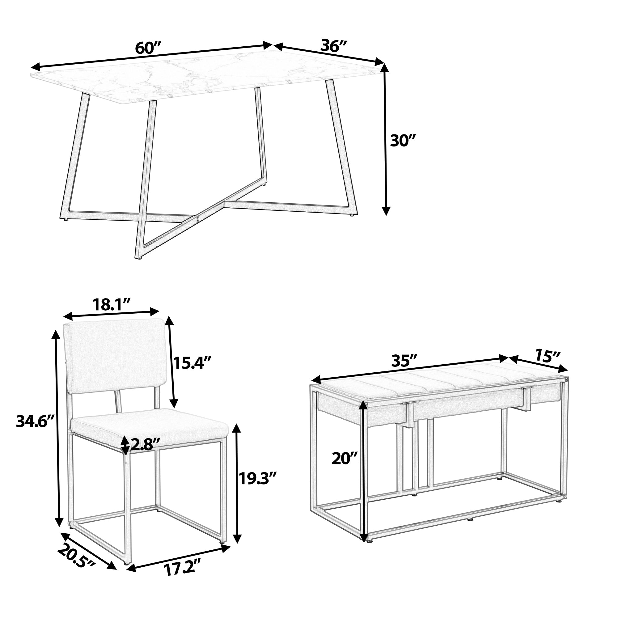 - [Faux Marble Dining Set]This stunning metal 5-piece dining table set combines style and functionality seamlessly. This set includes a table which features outward extending legs for added stability and space optimization, four chairs, and a bench. The stable triangular stretchers ensure durability while maintaining a sleek modern look. Topping it off is a stunning white faux marble tabletop with smooth corners, elevating any dining space with its elegance and safety.