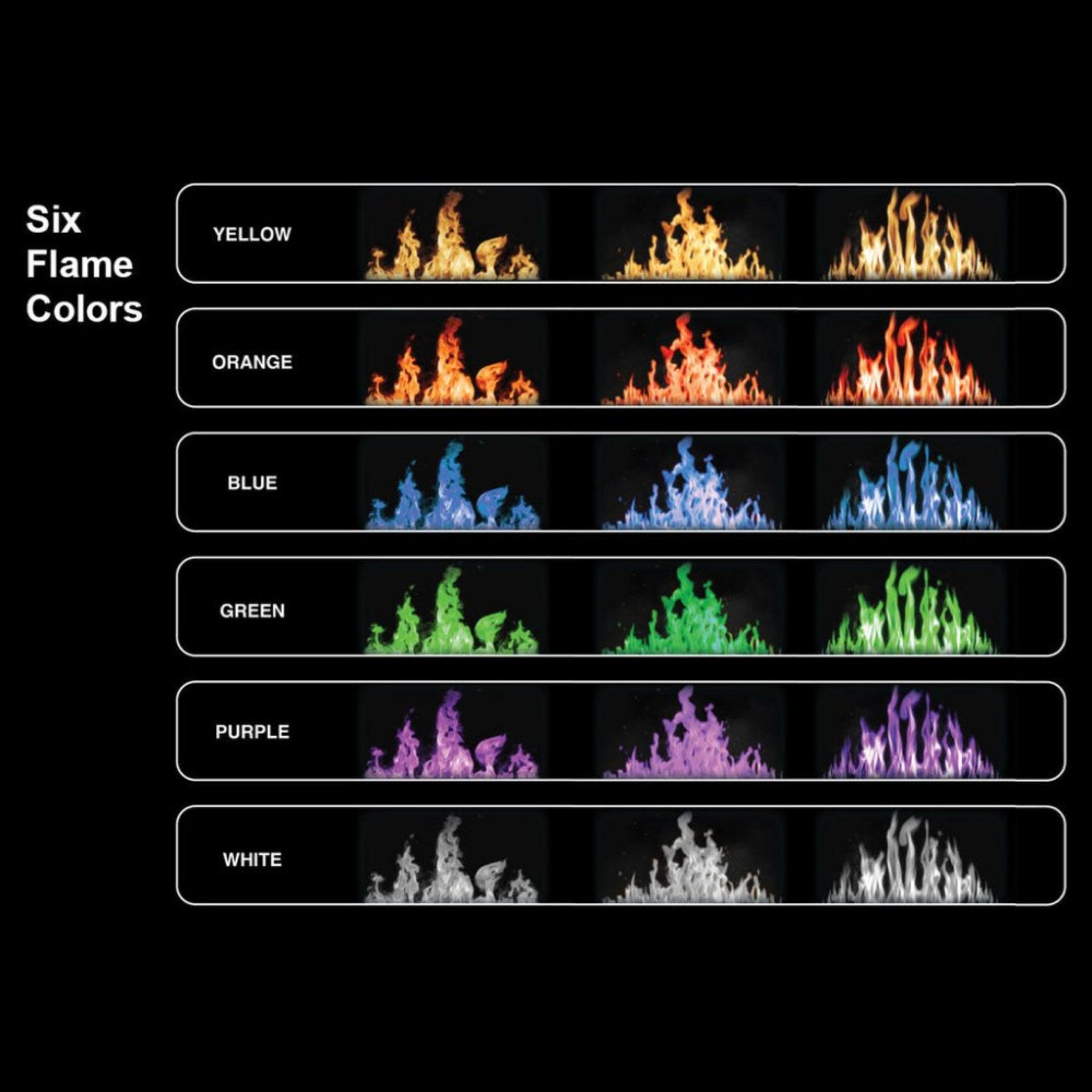 • Choose from three flame styles and six flame colors to match your mood or décor. With 18 different flame color displays and multi-color ember bed and downlighting, you can create a unique ambiance for any occasion.