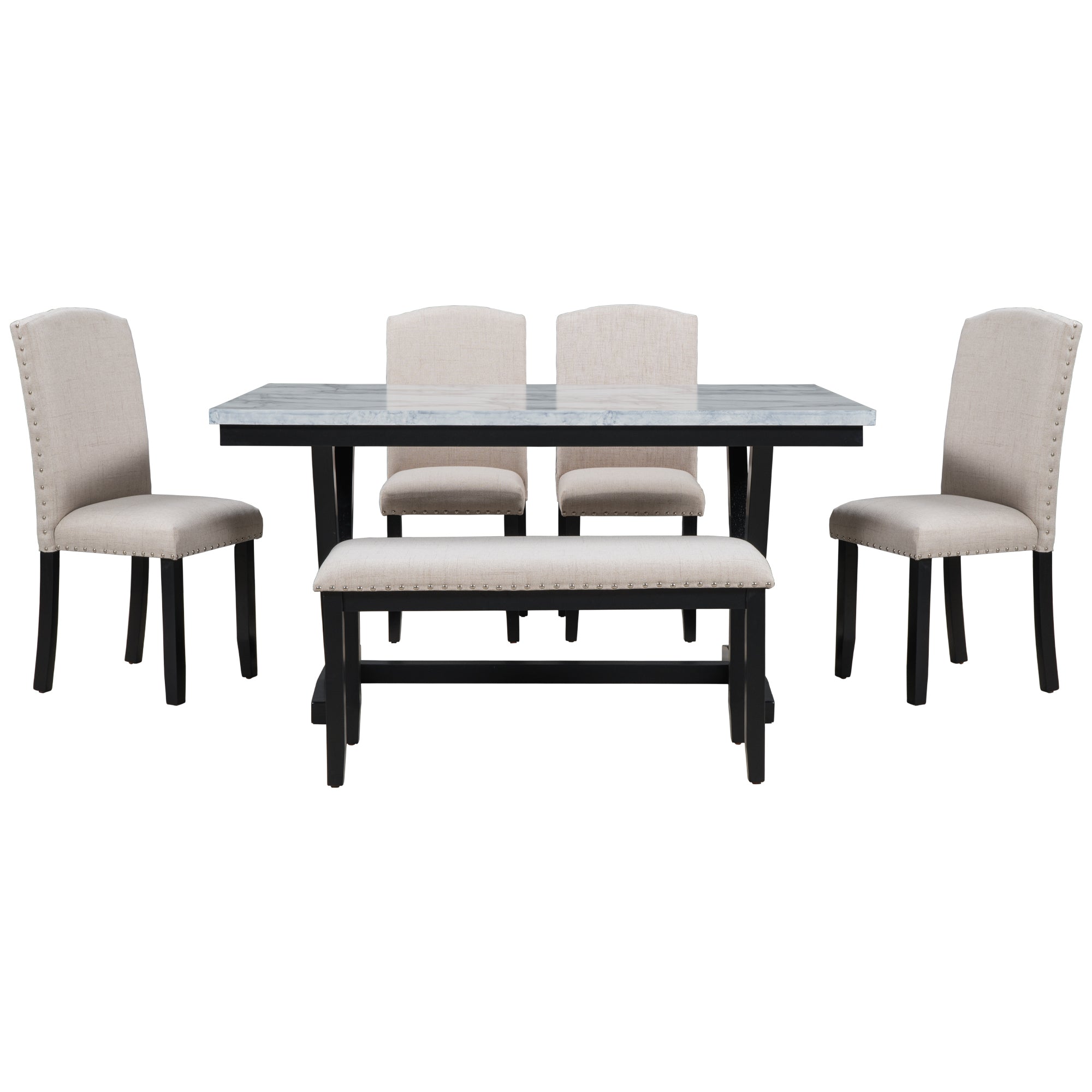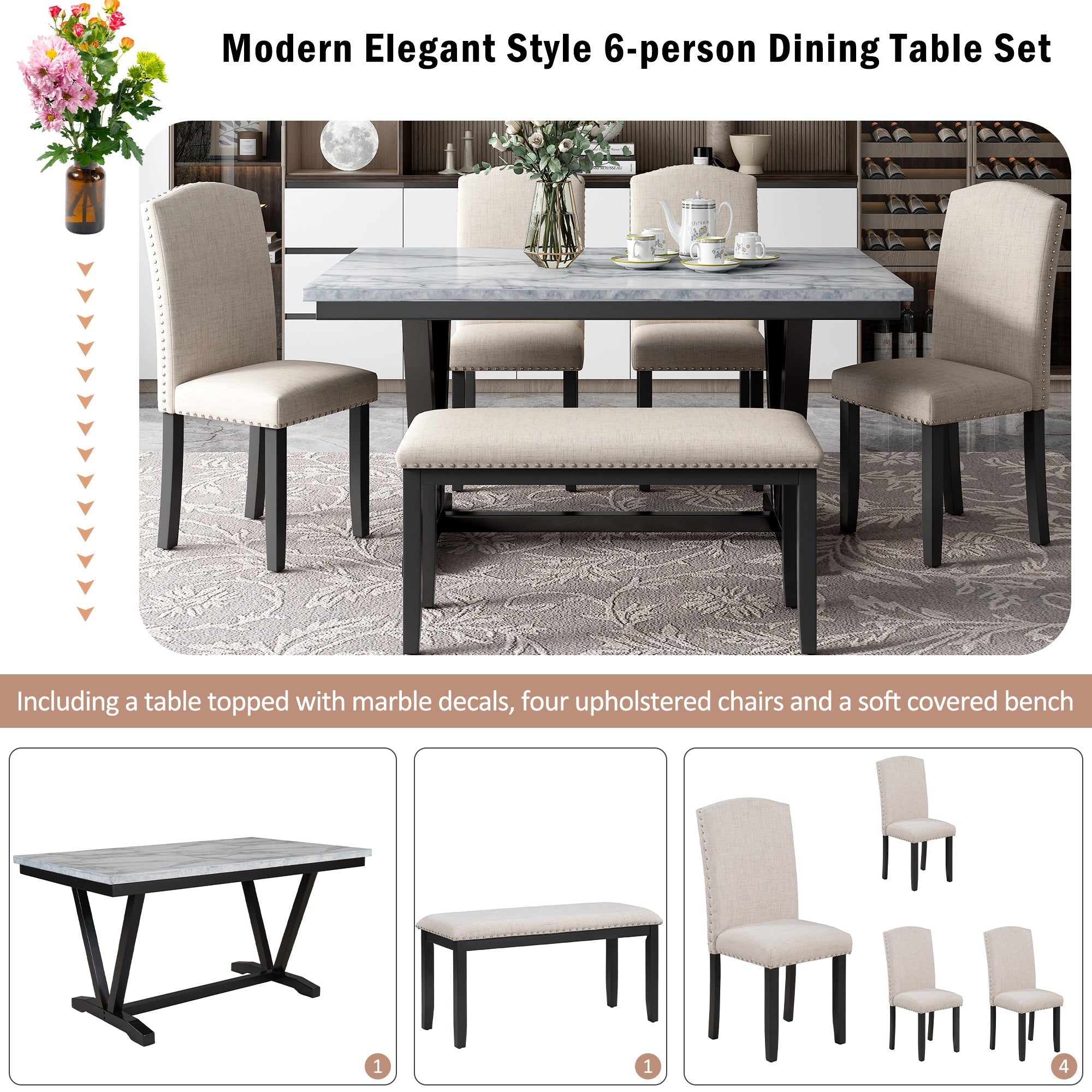 Modern Style 6-piece Dining Table with 4 Chairs & 1 Bench, Table with Marbled Veneers Tabletop and V-shaped Table Legs (White)