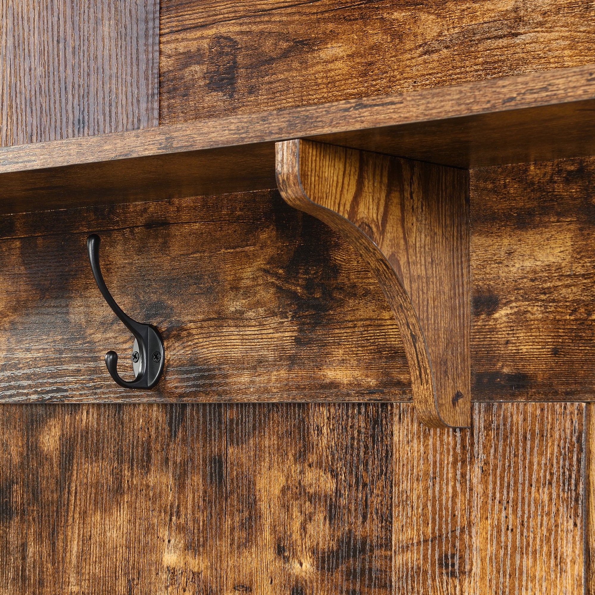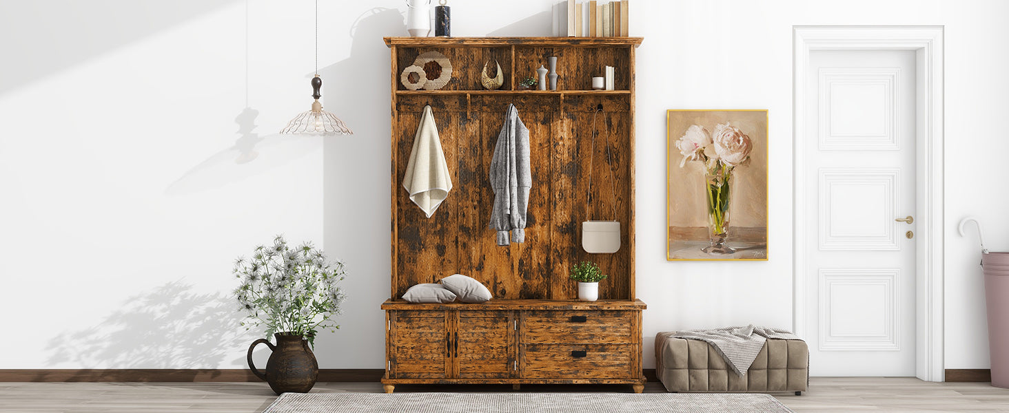 The functional design of this hall tree fully takes into account the actual needs in daily life. In addition to the three hooks under the two top compartments, two hooks are placed on the sides for more storage needs. The bottom of this hall tree is juxtaposed with a cabinet and two drawers to accommodate all kinds of items. And the wide bench is a wonderful place to sit and change shoes.