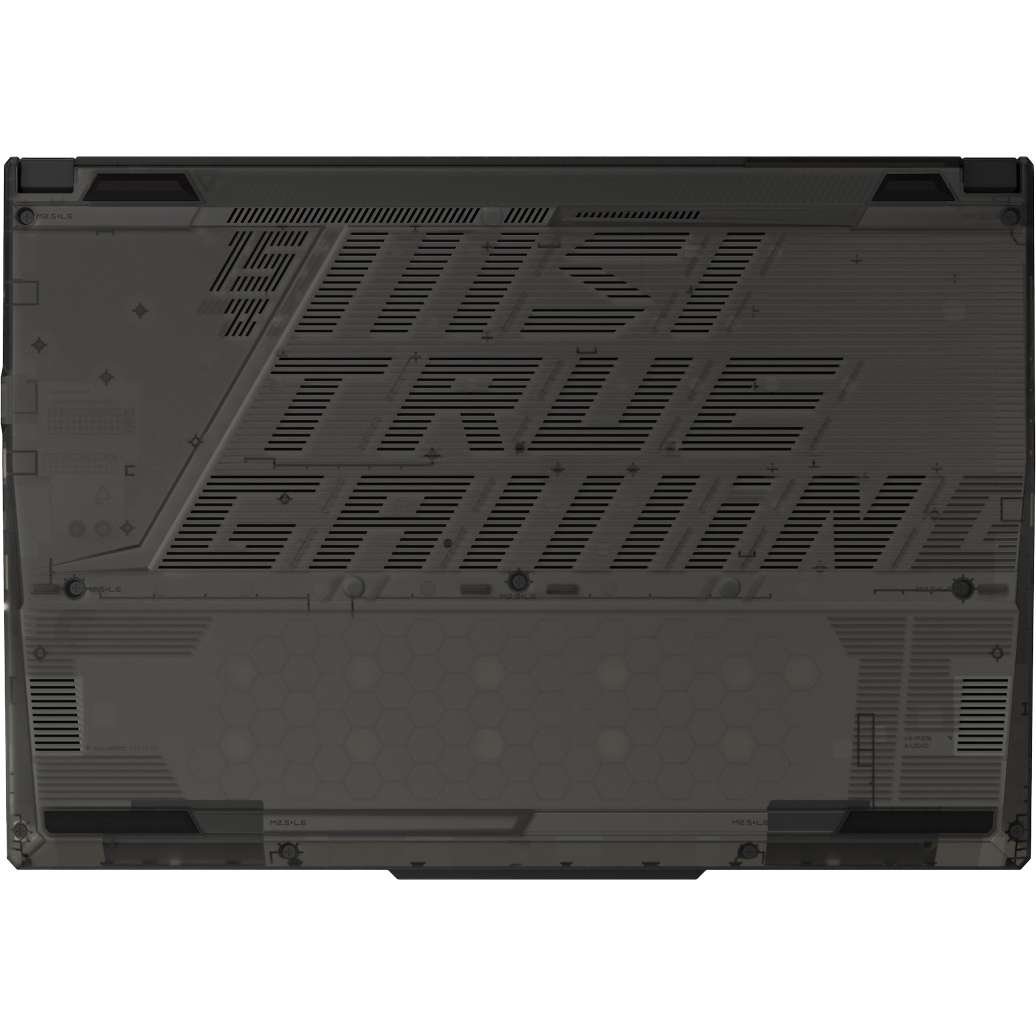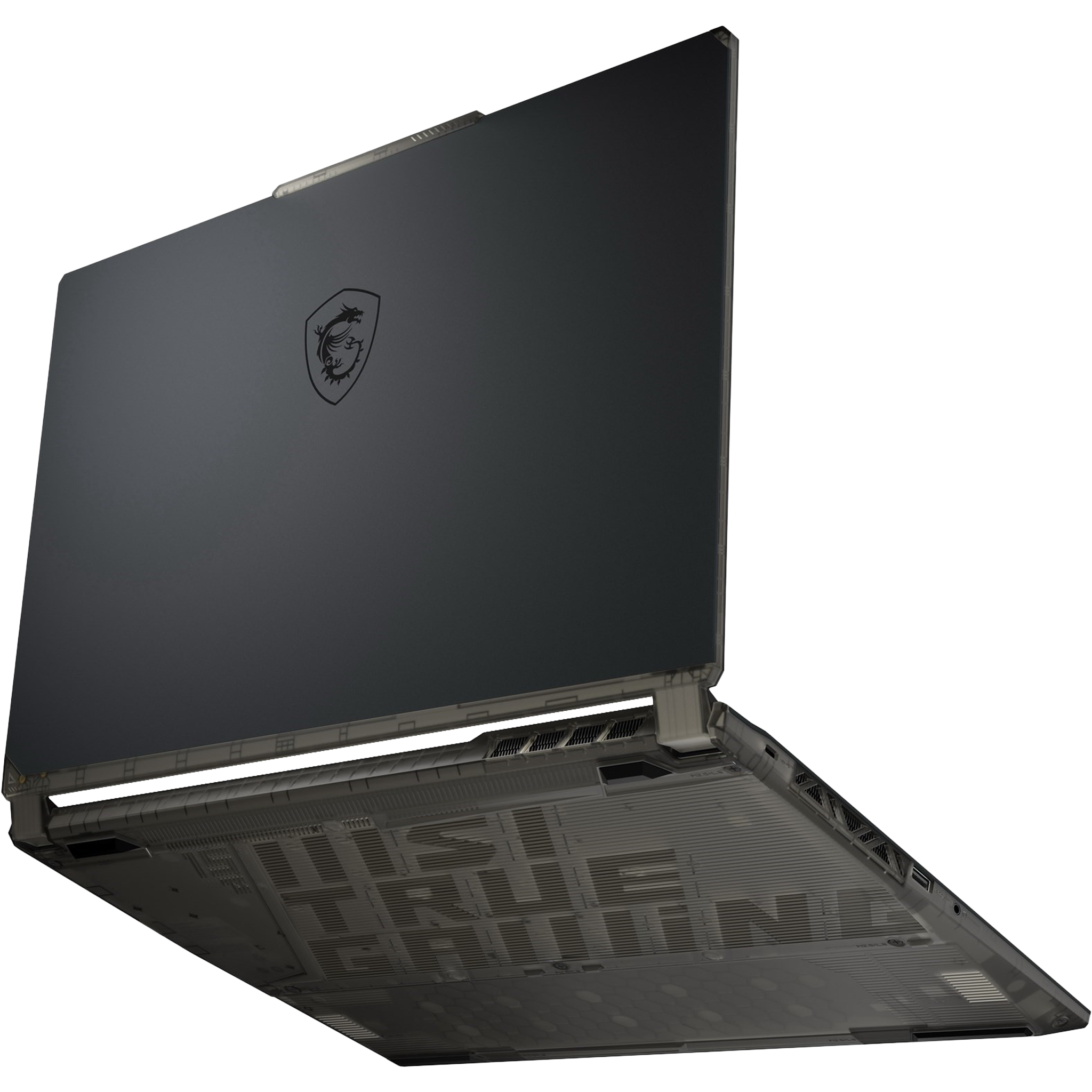 Geometric lines and shapes are drawn underneath the bottom plate, symbolizing modifications on cyborgs from Sci-Fi works, along with stylized texts hidden in the ventilation openings conveying MSI’s gaming spirits.