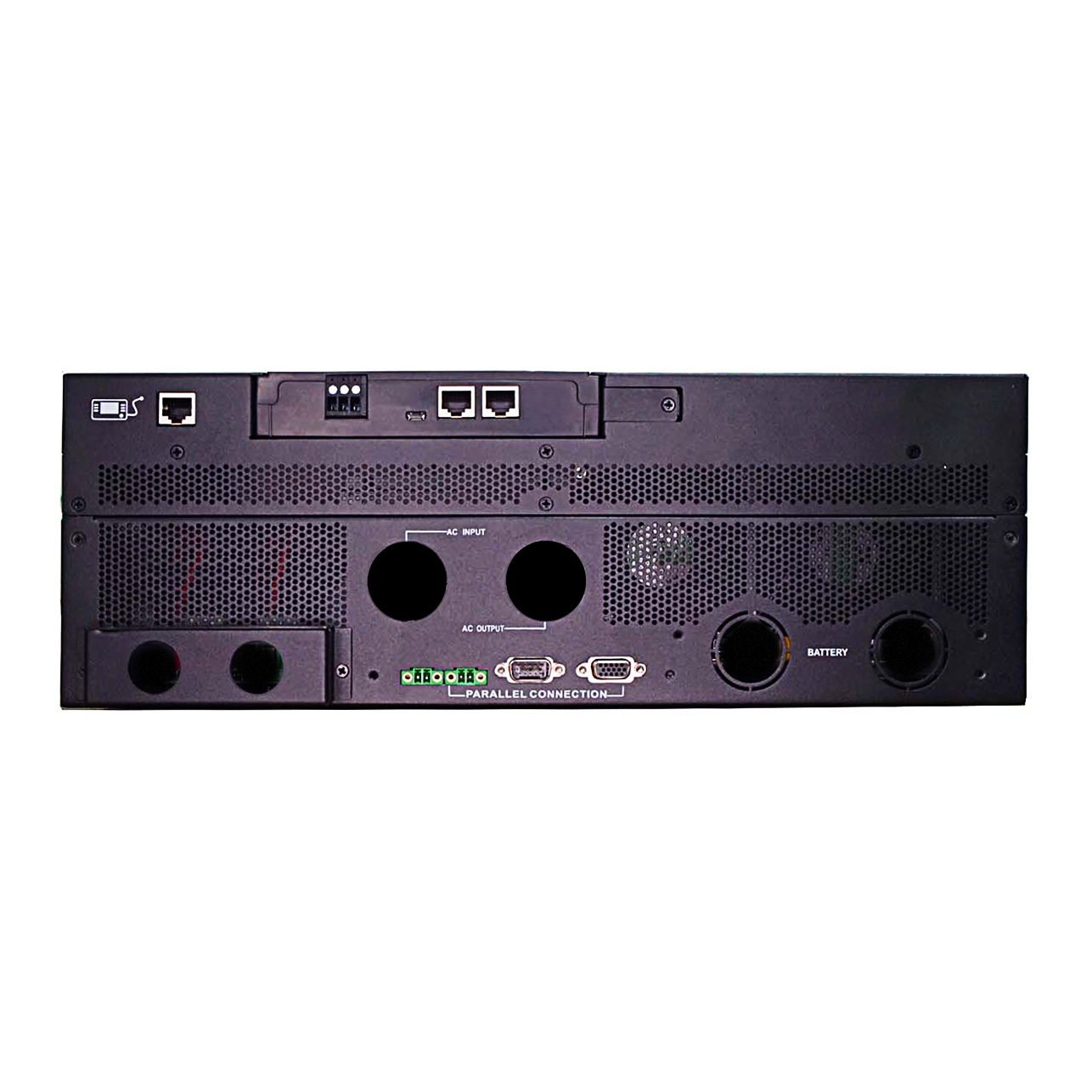 The comprehensive LCD display offers user-configurable and easy-accessible button operation including battery charging current, AC/Solar charger priority, and acceptable input voltage based on different applications.