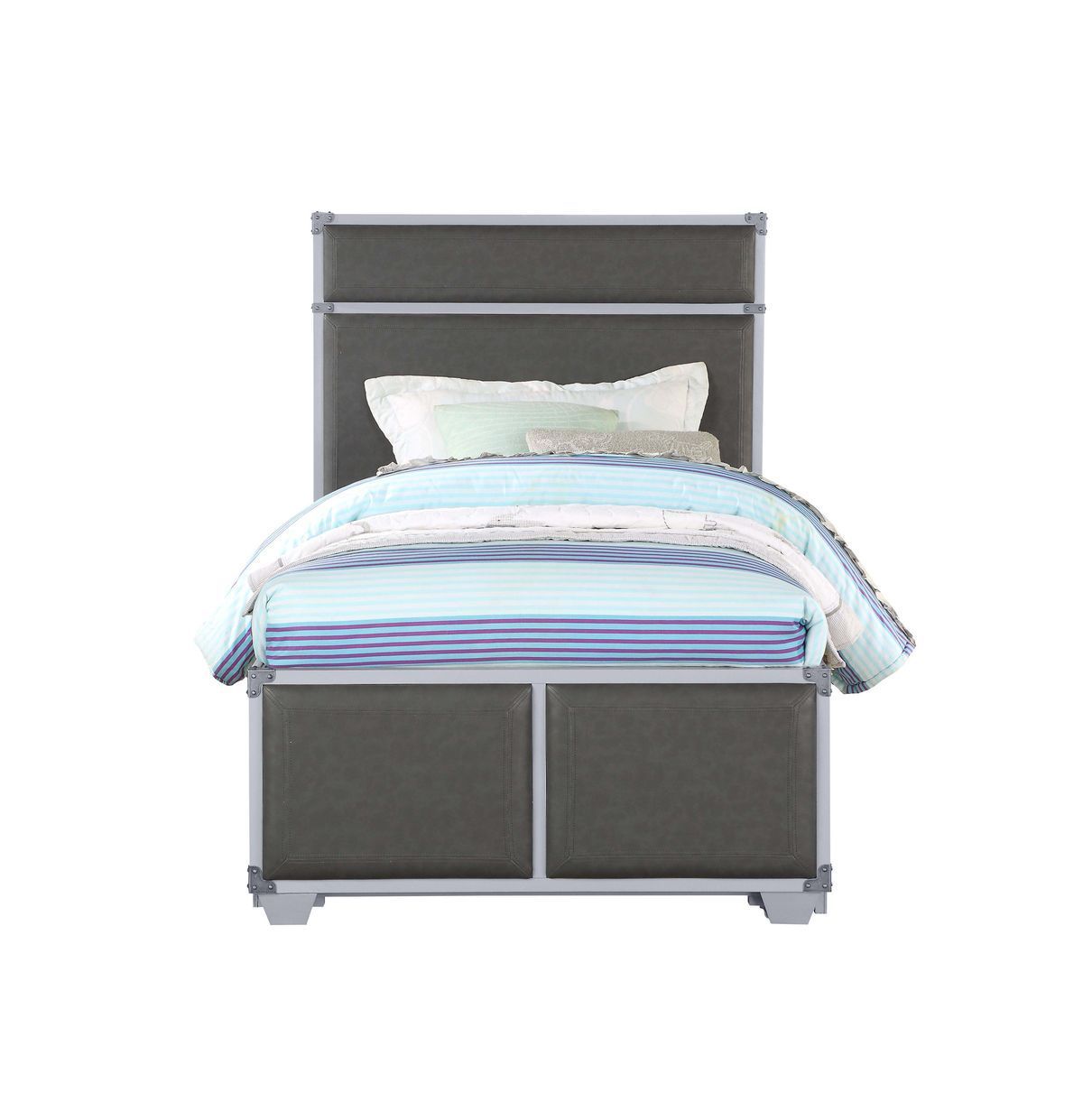 Product Details : 13 Slats – Box Spring Not Required : Panel Bed: Rectangular HB/FB (Low Profile FB) : Padded HB/FB: Gray PU () : Wooden Frame w/Metal Industrial Braces, Wooden Block Leg :: CONSTRUCTION] Wood & Padded Frame: Wood (Pine) :