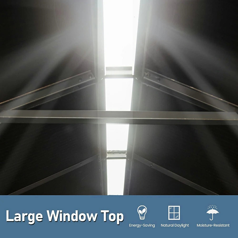 Integrated Ventilation & Water Drainage: Features built-in air vents for improved airflow and an integrated rain gutter system that channels water away from the structure to help prevent leaks and interior moisture buildup.