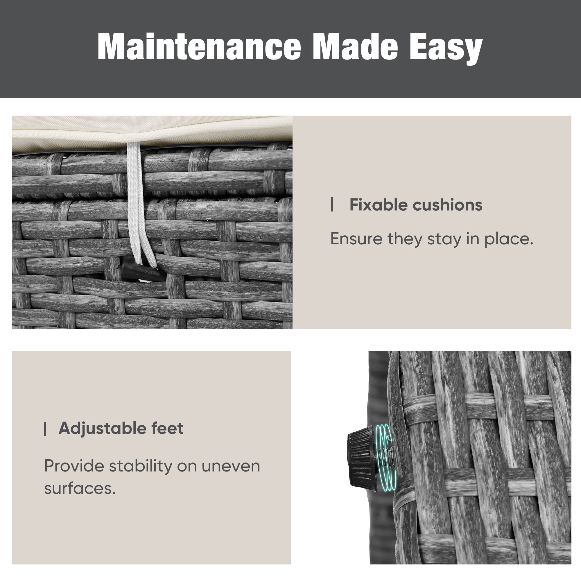 • [Maintenance Made Easy] Keeping your outdoor furniture in pristine condition is effortless with washable cushion and pillow covers. The fixable cushions ensure they stay in place, even on windy days, while the adjustable feet provide stability on uneven surfaces. This thoughtful design means you can enjoy your outdoor oasis without the hassle of constant upkeep.