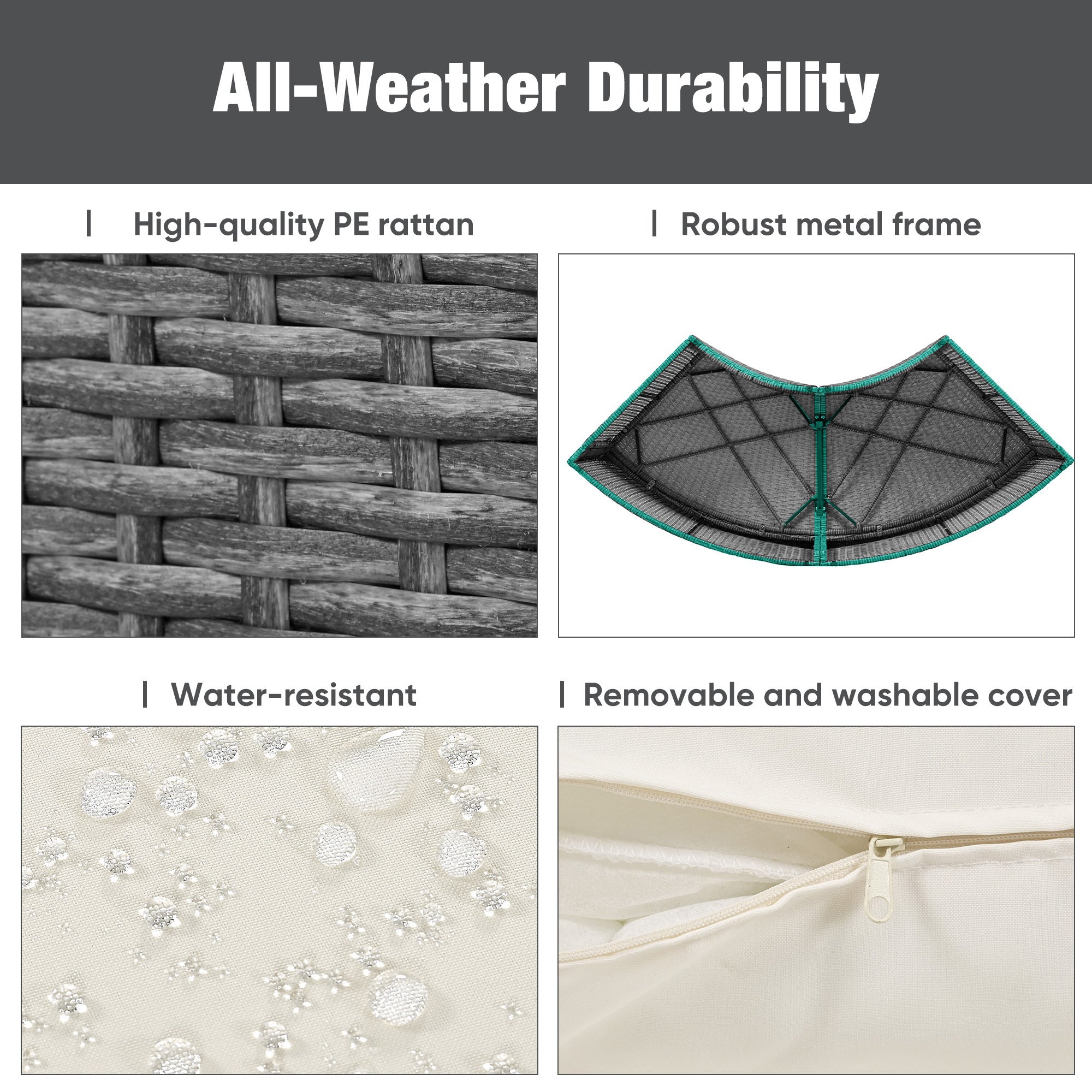 • [All-Weather Durability] Crafted with high-quality PE rattan, this 5-piece outdoor sectional sofa set is designed to withstand all weather conditions, ensuring long-lasting beauty and functionality. The robust metal frame provides a strong foundation, making it perfect for any outdoor gathering or relaxation space. Its resilience against the elements makes it an ideal choice for your garden, patio, or poolside, offering both elegance and durability.