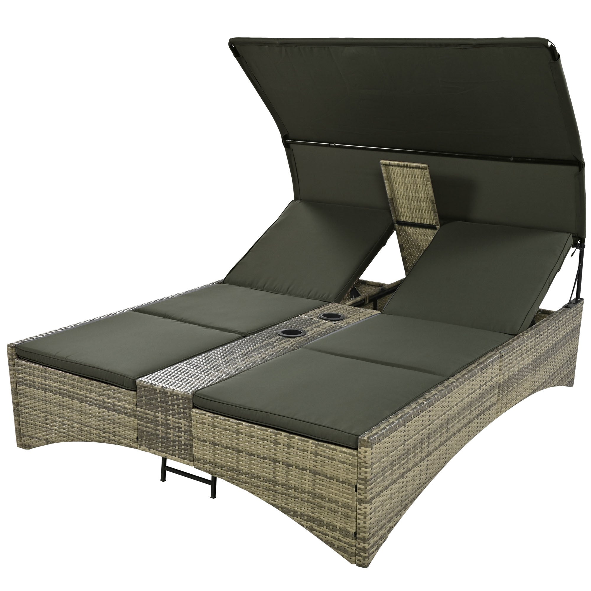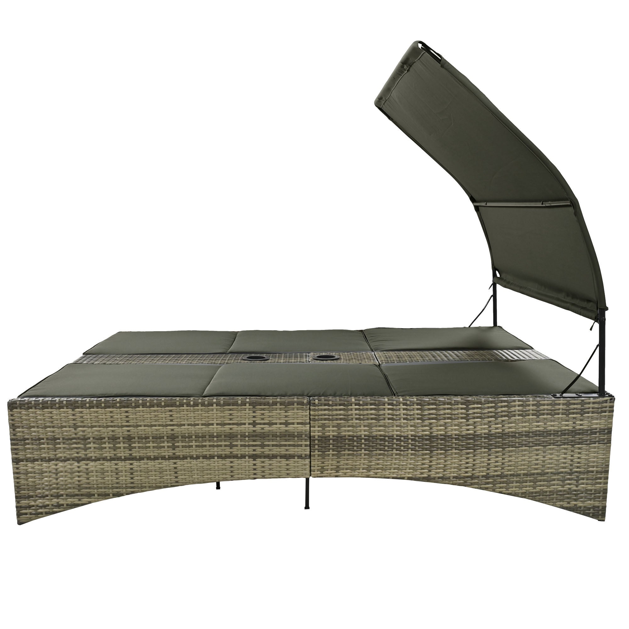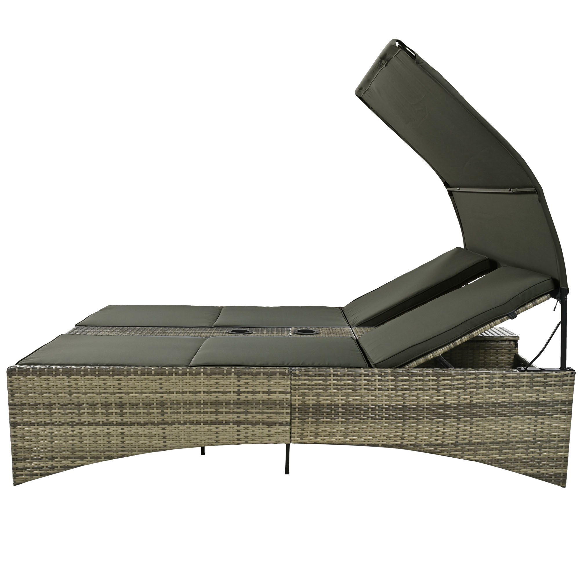 Patio Daybed Outdoor Daybed Outdoor Rattan Sun Lounger with Shelter Roof with Adjustable Backrest, Storage Box and 2 Cup Holders for Patio, Balcony, Poolside,Grey