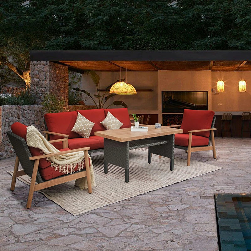 Create the ultimate outdoor oasis with the Domi Outdoor Living Patio Furniture Sets. Crafted with care, this 4-piece set combines the timeless elegance of wood with the durability of aluminum and rattan. Experience comfort like never before as you sink into the high-density padded sponge cushions, designed to provide exceptional support and relaxation. The splash-resistant fabric in a stunning khaki and red color combination adds a touch of style and practicality to your outdoor space. Whether you’re hosting a gathering or seeking a peaceful retreat, this patio conversation set is the perfect choice for those who appreciate quality, comfort, and style.